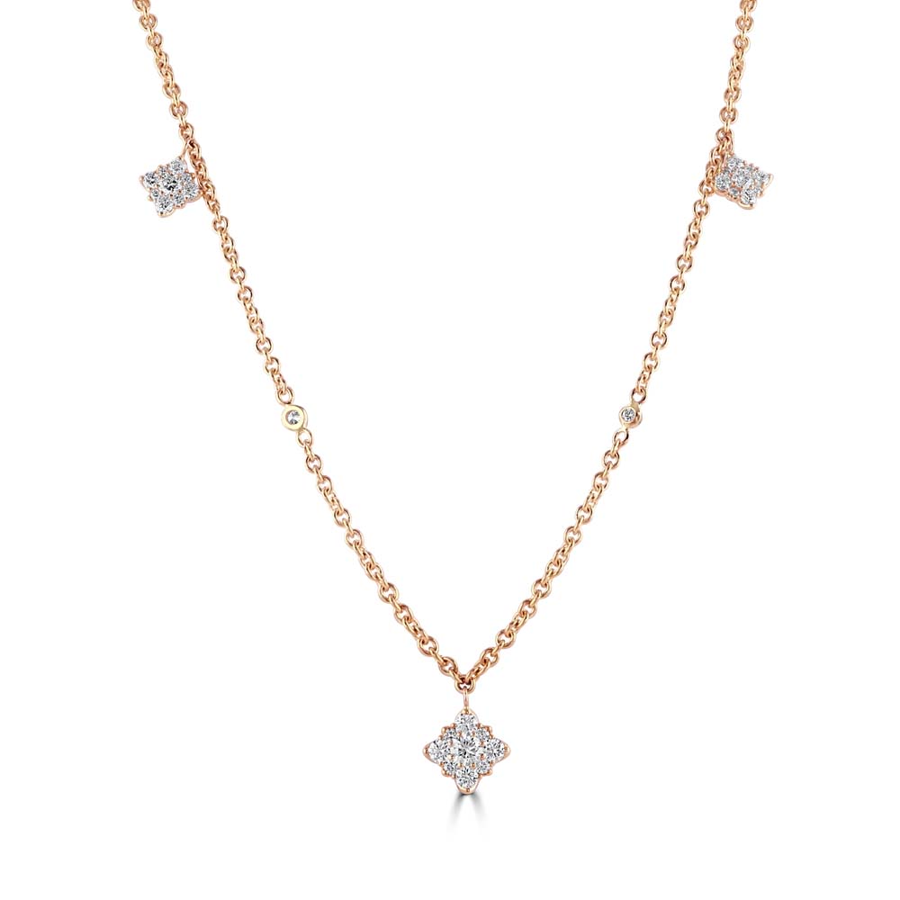 Indulge in luxury with this exquisite 18ct rose gold necklace. Featuring three square-shaped diamond clusters, each cluster is composed of nine round brilliant-cut diamonds, creating a stunning display of sparkle and elegance. The total diamond weight for the necklace is 0.83ct, ensuring a captivating brilliance. The 16-inch integrated trace chain is adorned with four evenly spaced rubover set round brilliant-cut diamonds, adding an extra touch of sophistication. The necklace is finished with a lobster clasp, which is also set with a single diamond, providing a secure and stylish closure. The warm, romantic hue of the rose gold beautifully complements the radiant diamonds, making this necklace a perfect accessory for any occasion. Whether you're dressing up for a special event or adding a touch of elegance to your everyday look, this necklace is the ideal piece to elevate any outfit. Experience the perfect blend of modern design and timeless beauty with this 18ct rose gold necklace. It is not just a piece of jewellery, but a statement of refined taste and style.