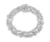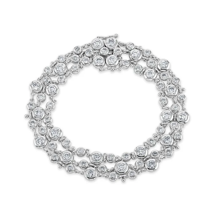 Our 18ct white gold diamond bracelet is a luxurious masterpiece designed to captivate and charm. This exquisite bracelet features a breathtaking arrangement of three rows of alternating large and small round brilliant cut diamonds, meticulously set to showcase their spectacular brilliance and fire. Adorning this sophisticated piece are 23 larger diamonds, collectively weighing 3.24cts, each with a colour grade of G and a clarity of SI. These diamonds are complemented by 46 smaller diamonds, totalling 1.57cts, also boasting a colour grade of G but with a superior clarity of VS. The careful selection and placement of these diamonds create a harmonious balance of light and sparkle, making this bracelet a true symbol of luxury and refinement. Crafted from the finest 18ct white gold, the bracelet's setting offers a sleek and contemporary backdrop that enhances the diamonds' natural beauty. The bracelet is secured with a robust tongue clasp, further reinforced by two figure-of-eight clasps, ensuring both safety and comfort without compromising on style. Whether you're attending a glamorous event, celebrating a special occasion, or simply seeking to add a touch of luxury to your everyday wear, this 18ct White Gold Diamond Bracelet promises to be a versatile and cherished addition to your jewellery collection. Its timeless design and exceptional craftsmanship make it a perfect heirloom piece, destined to be treasured for generations.