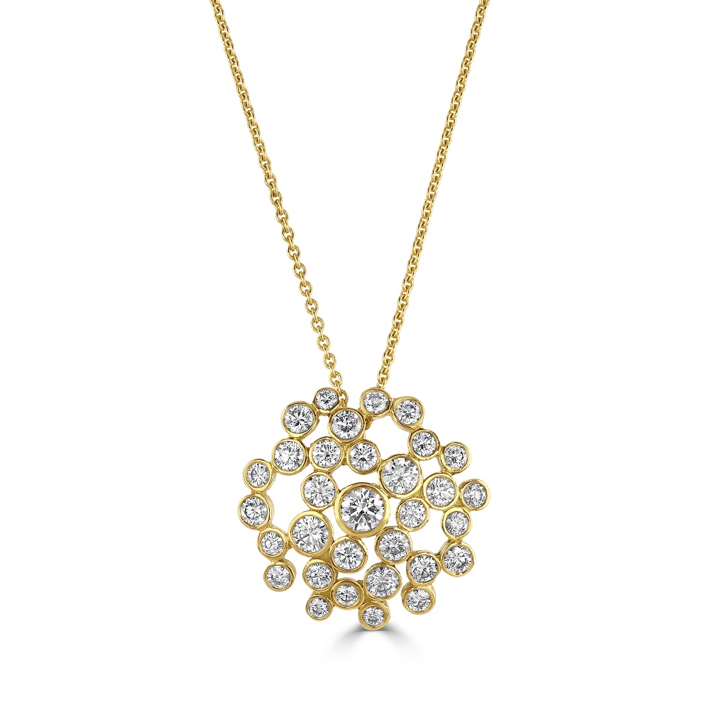 Our 18ct yellow gold bubble pendant are a symbol of luxury and sophistication. This exquisite pendant is adorned with 32 round brilliant cut diamonds, each carefully rub set to create a mesmerizing display of sparkle and brilliance. With a total diamond weight of 1.80cts, these gems boast an assessed grade of H colour and SI clarity, ensuring a dazzling light reflection that captures the essence of timeless beauty.