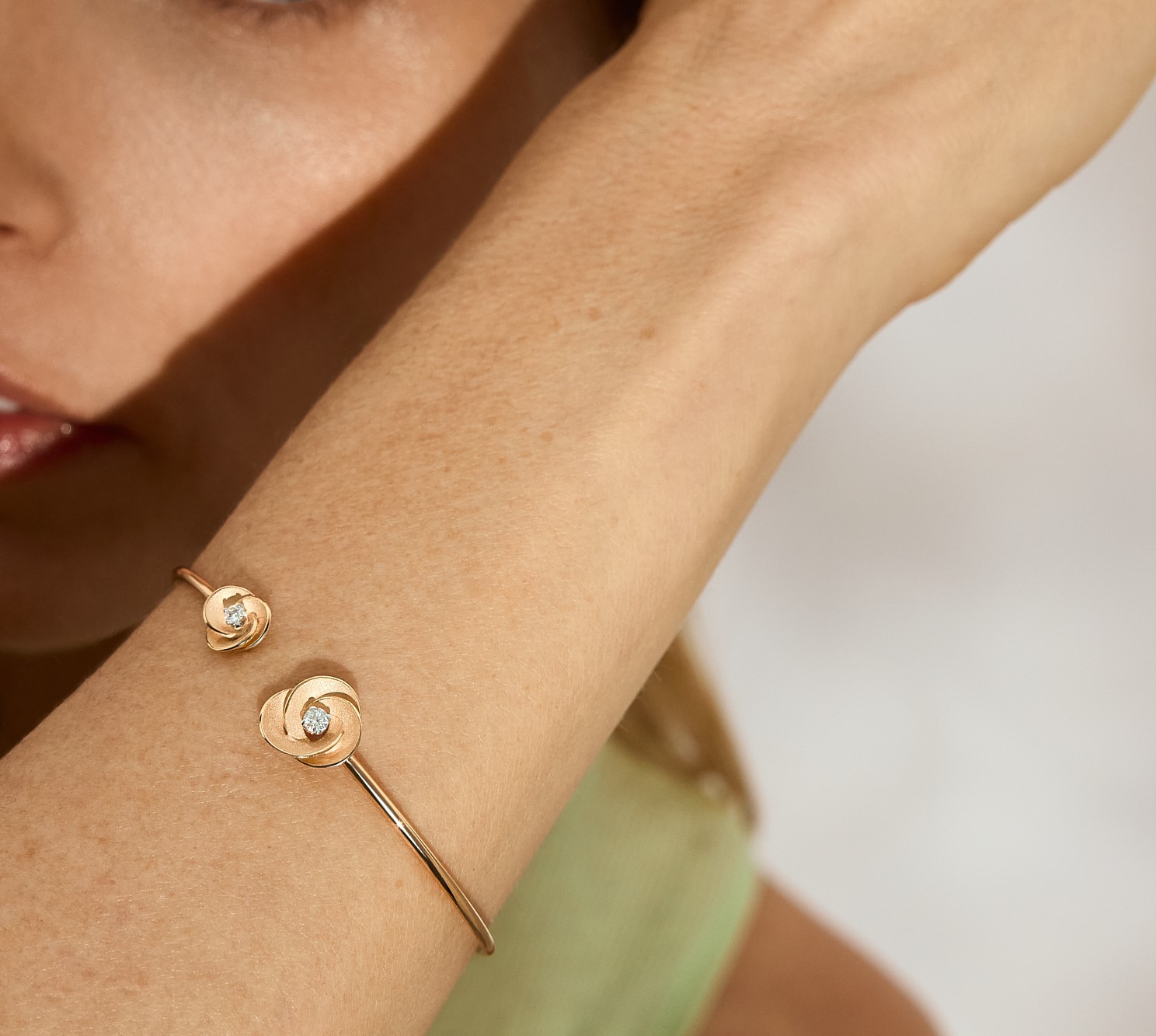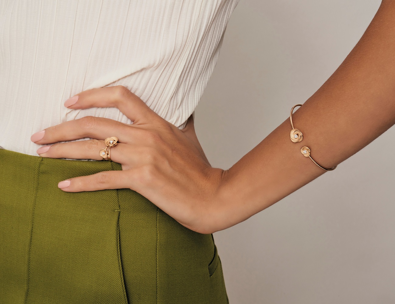 The thin gold ribbons of Essential intertwine in a playful spiral, creating harmonious rounded forms that resemble a stylised flower. Desert Rose encapsulates all the simplicity of the Dune collection, combined with the charm of a delicate flower. A collection with a vibrant and discreet design, for those who want to add a touch of style to their everyday look.