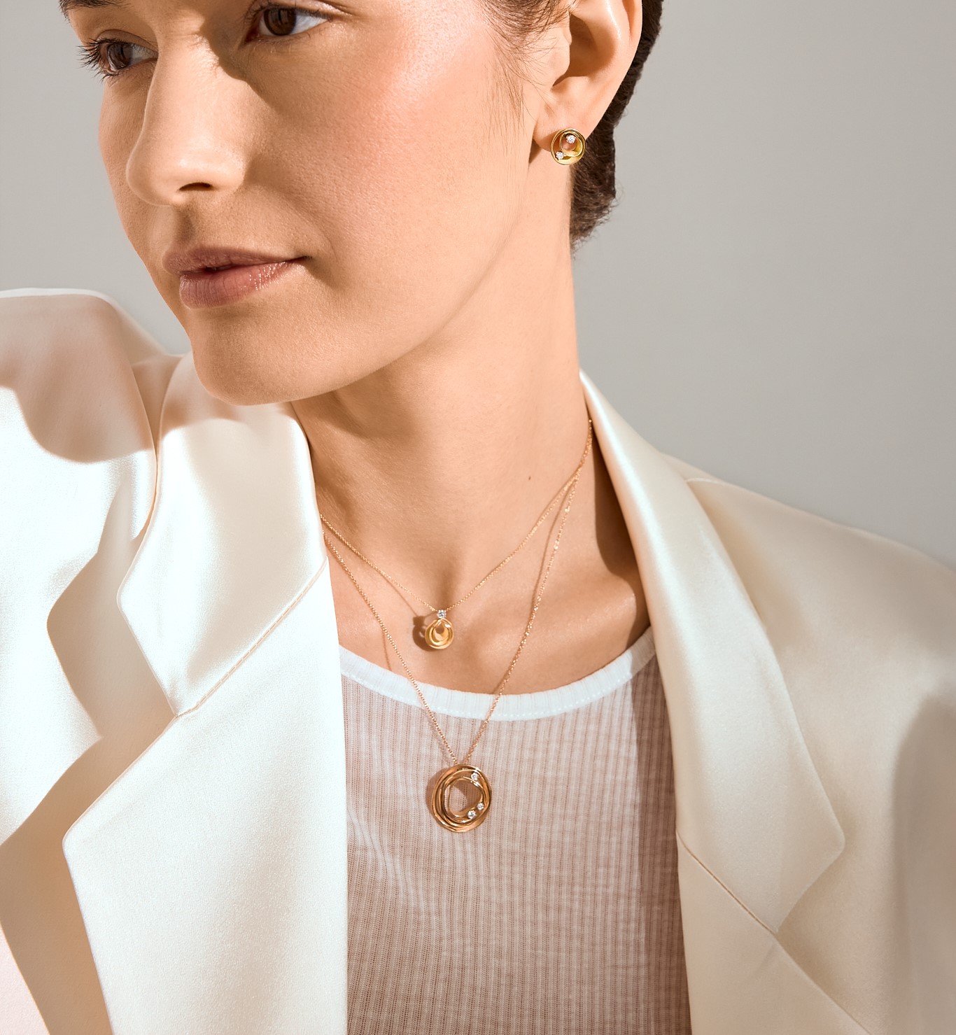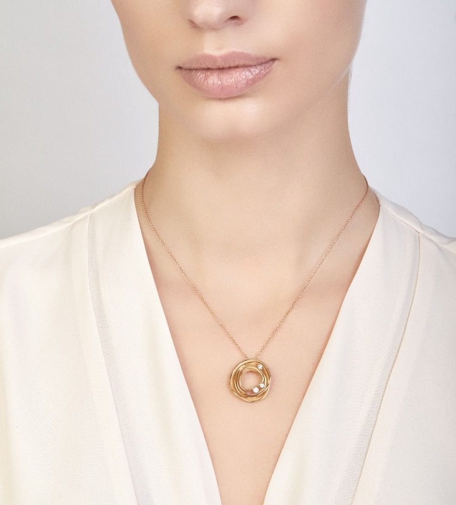 This gorgeous Dune pendant has irregular curves replicating the dynamism of desert dunes which are in a soft motion effect that are interspersed with precious diamonds. The precious alternation between velvety surfaces in the depths and glossy gold on the thin and irregular golden edges are characteristic of the Dune collection and give three-dimensionality to this fabulous jewellery.