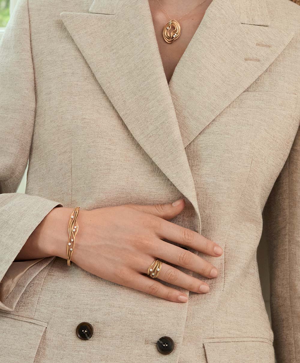 This beautiful Dune bangle has irregular curves replicating the dynamism of desert dunes which are in a soft motion effect that are interspersed with precious diamonds. The precious alternation between velvety surfaces in the depths and glossy gold on the thin and irregular golden edges are characteristic of the Dune collection and give three-dimensionality to this fabulous jewellery.