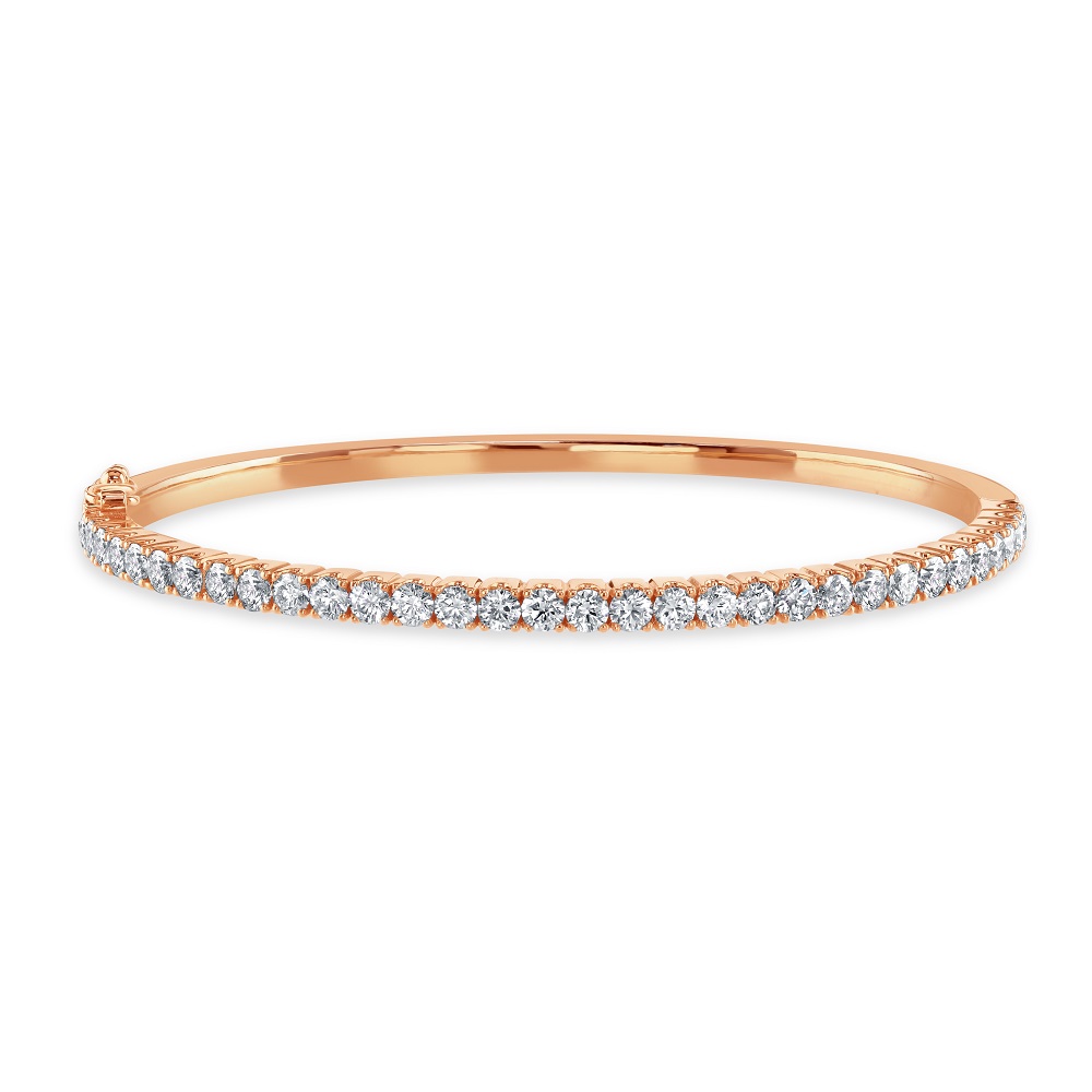 Introducing our exquisite 18ct rose gold oval hinged bangle, a statement of luxury and timeless elegance. This sophisticated bangle features a single row of 32 round brilliant cut diamonds, each meticulously four claw-set to maximize their dazzling effect. The total diamond weight of 2.56 carats creates an impressive display of sparkle that complements the warm, pink hues of the rose gold. Designed with a hinged opening for ease of wear, this bangle combines both style and functionality. Its oval shape contours gracefully around the wrist, making it a comfortable and stunning addition to any jewellery collection. Ideal for special occasions or as a cherished gift, this rose gold bangle is perfect for those who appreciate the finer things in life.