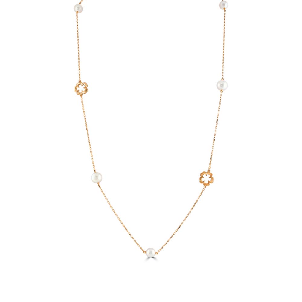 This elegant adjustable slider chain from Mikimoto is beautifully crafted in 18ct rose gold. It features a charming design that includes six Akoya cultured pearls, scattered along the chain. Each pearl, renowned for its lustrous sheen and perfect round shape, adds a touch of timeless elegance. Complementing the pearls are three delicate flower shapes, each meticulously set with round brilliant cut diamonds. These diamonds add a sparkling contrast to the soft glow of the pearls, capturing the essence of natural beauty. The slider mechanism on the chain allows for easy length adjustment, offering a versatile and personalized fit. The combination of the scattered Akoya pearls and the diamond-set flowers, all presented on the warm rose gold chain, makes this piece a sophisticated and enchanting accessory, perfect for adding a touch of refined luxury to any ensemble
