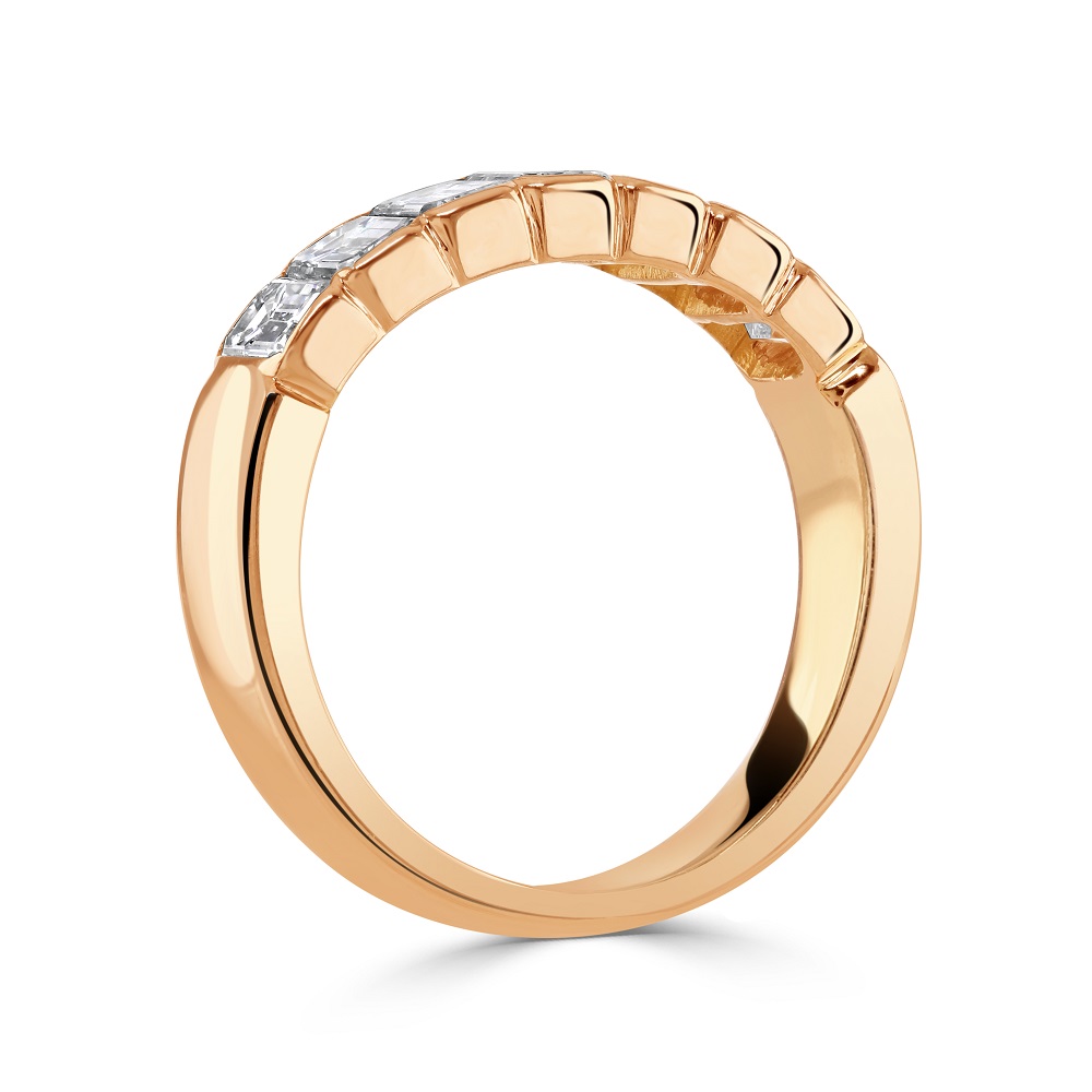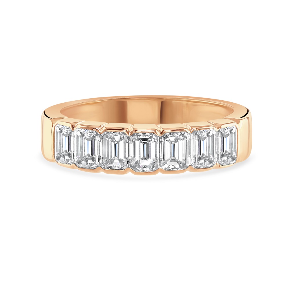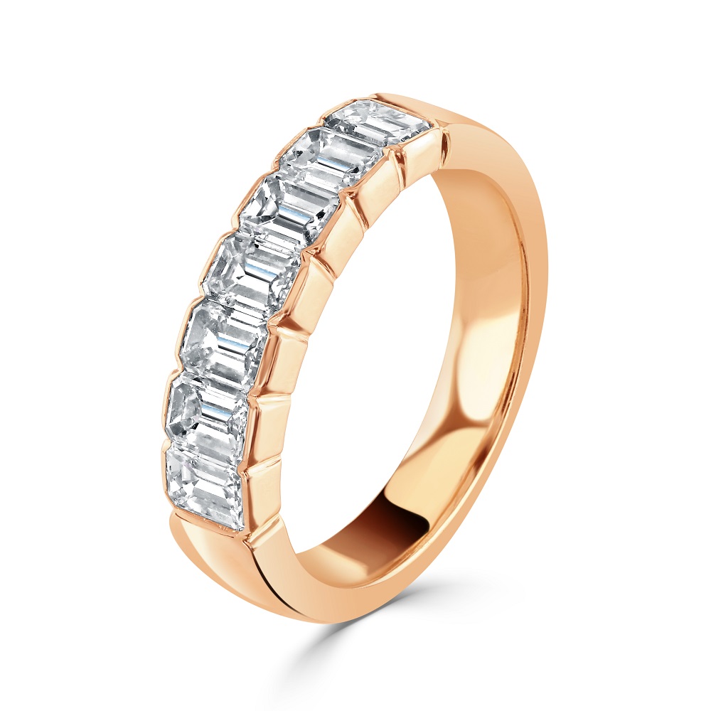 An exquisite 18ct rose gold eternity ring, a symbol of everlasting elegance and luxury. This stunning piece is meticulously rubover set with seven emerald cut diamonds, totalling a weight of 1.51ct. Each diamond has been carefully selected for its exceptional clarity and captivating sparkle, embodying sophistication, and timeless beauty.