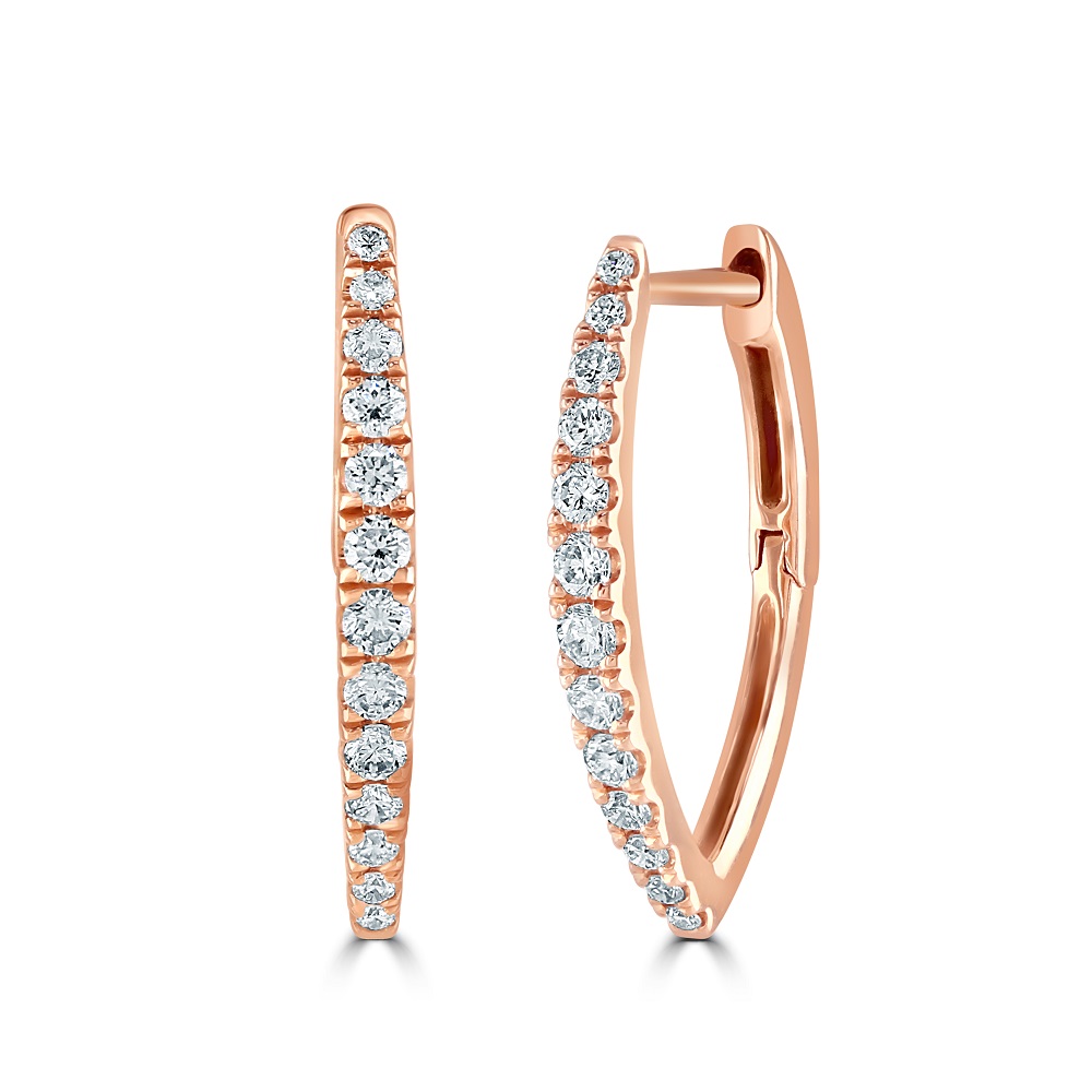 Our elegant 18ct rose gold graduated 'V' shaped hoop earrings, meticulously crafted to embody sophistication and contemporary charm. These exquisite earrings feature a unique V-shaped design, gracefully hugging the earlobe for a sleek and stylish look. Each earring is adorned with claw-set round brilliant-cut diamonds, carefully arranged in a graduated pattern that enhances their inherent sparkle.