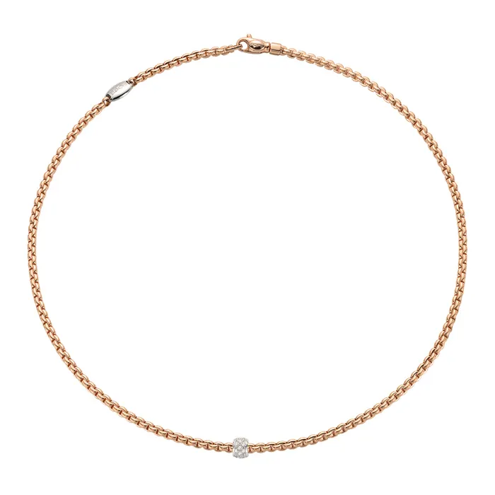 Introducing the luxurious 18ct rose gold Eka necklet from Fope Gioielli, a testament to Italian elegance and expert craftsmanship. This exquisite necklet combines the warm tones of 18ct rose gold with a sophisticated brick link belcher design, offering a unique and contemporary aesthetic. The highlight of this piece is a stunning white gold rondel, fully pavé-set with sparkling diamonds, totalling 0.19 carats. The diamonds add a radiant touch to the delicate rose gold backdrop, creating an eye-catching contrast. Measuring 45cm in length, this necklet sits perfectly at the collarbone, making it an ideal accessory for both formal and casual occasions. Perfect for those who cherish detailed artistry and timeless design, this necklet is a magnificent addition to any fine jewellery collection.