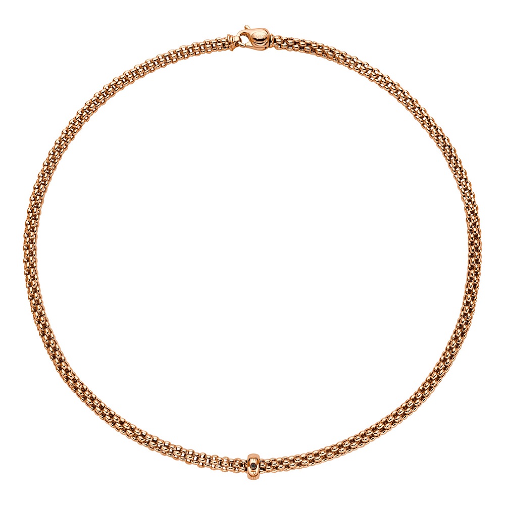 Embrace understated luxury with our 18ct rose gold Flex'it solo necklace from the esteemed Fope Gioielli. This elegant necklace features a uniquely designed rondel at its centre, showcasing a singular black diamond that adds a sophisticated touch of intrigue. The diamond's subtle weight of 0.01 carats is perfectly complemented by the warm tones of the rose gold, offering a contemporary twist on classic elegance. Measuring 43cm in length, this necklace fits comfortably, adapting to your movements thanks to Fope's innovative Flex'it design, which provides a seamless and flexible fit. Ideal for those who appreciate refined, minimalist jewellery with an edge, this necklace is a perfect choice for daily wear or special occasions, adding a touch of luxury to any outfit.