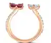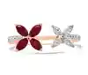 Discover the enchanting beauty of our 18ct rose gold open ring, a stunning display of floral elegance and artistic design. This unique ring features two delicately crafted flowers: one bloom is claw-set with four marquise-cut rubies totalling 0.77 carats, radiating vibrant red hues, while the other sparkles with four marquise-cut diamonds totalling 0.55 carats. The ring's shoulders are further embellished with round brilliant-cut diamonds, enhancing its overall brilliance and charm. Crafted in lustrous 18ct rose gold, this ring marries the natural beauty of floral motifs with the luxury of precious gemstones. Perfect for those seeking a statement piece with a romantic touch, it makes a magnificent choice for special occasions or as an eye-catching addition to any fine jewellery collection.