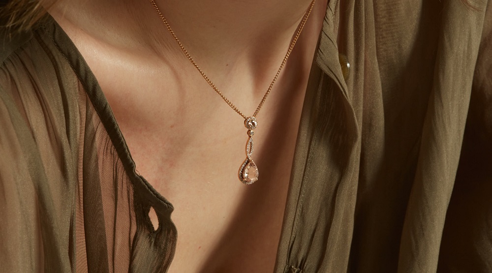 Designed for those who cherish unique and sophisticated jewellery, this drop pendant is perfect for special occasions, offering a touch of glamour and a statement of refined taste. Whether it's a gift for a significant other, a milestone celebration, or a luxurious addition to your personal collection, this rose gold morganite and diamond pendant is sure to captivate and enchant, promising to be a beloved treasure for years to come.