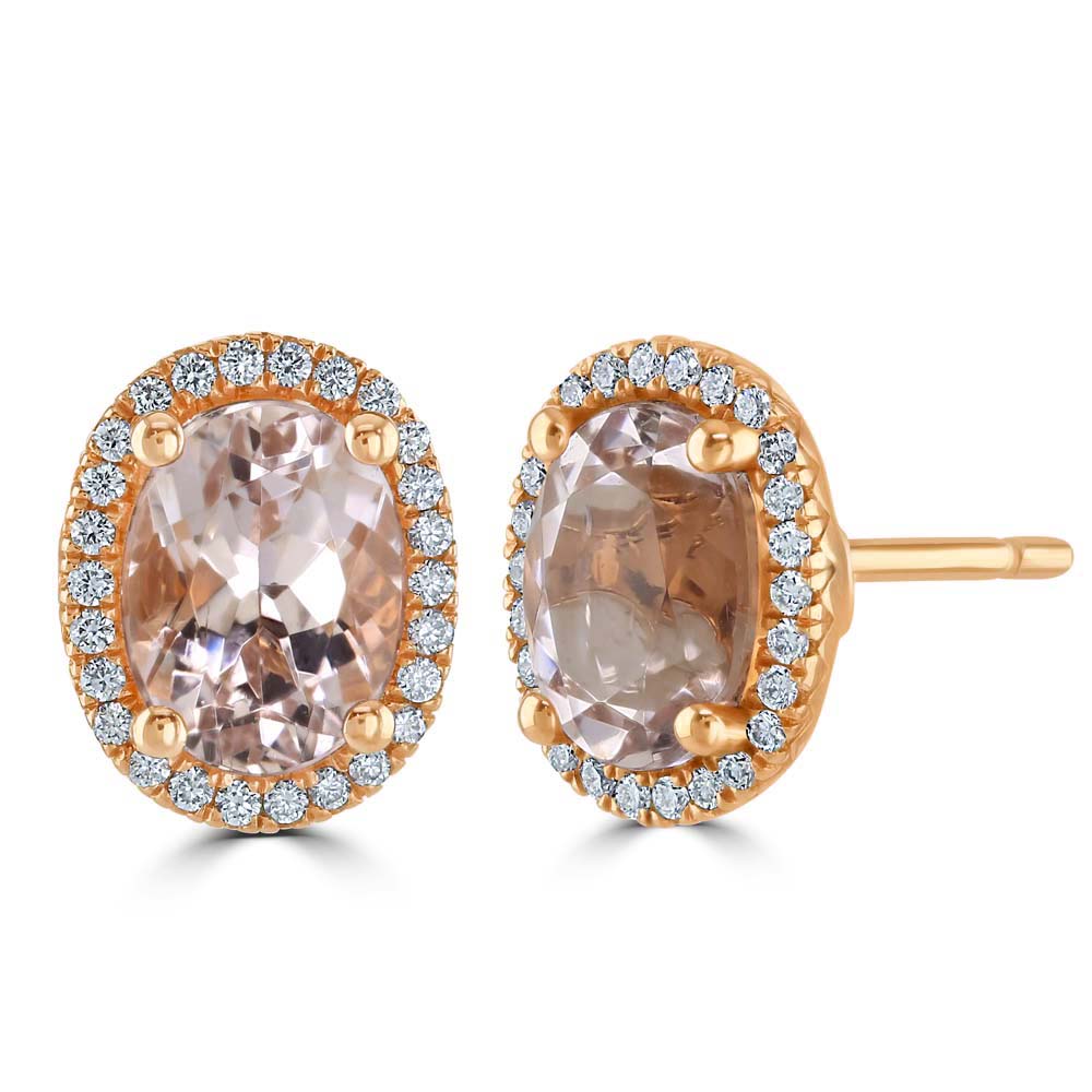 A luxurious pair of 18ct rose gold stud earrings, a piece of elegance and refined taste. At the core of each earring lies a mesmerizing oval-cut morganite, totalling 2.28ct, securely held by four claws. The morganite's soft pink hue radiates warmth and femininity, perfectly complemented by the romantic tones of the rose gold setting. Encircling this captivating gemstone is a halo of meticulously selected round brilliant-cut diamonds, totalling 0.20ct, that add an extra layer of sparkle and allure to the design.
