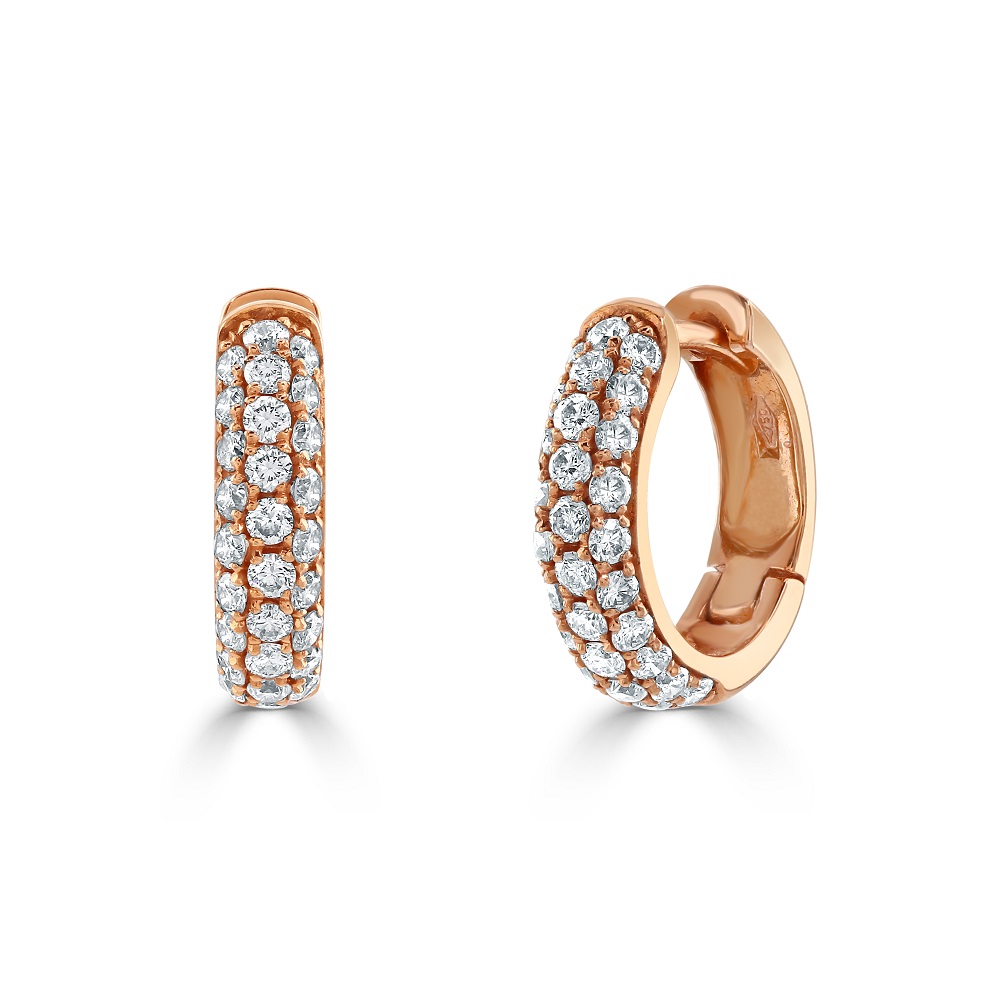 Our luxurious 18ct rose gold diamond hoop earrings are exquisitely pavé set with 62 round brilliant cut diamonds. These elegant earrings feature a hinge in the middle, allowing for a comfortable fit and graceful movement, while showcasing a total diamond weight of 0.64ct. The warm hues of the rose gold perfectly complement the sparkling diamonds, creating a stunning effect that catches the eye.