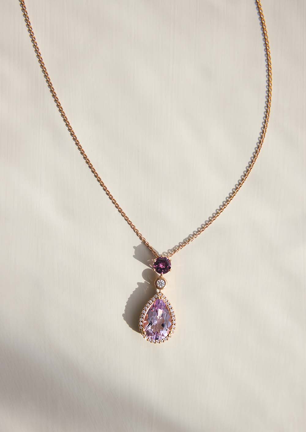 18ct Rose Gold Amethyst, Rhodolite and Diamond Pendant