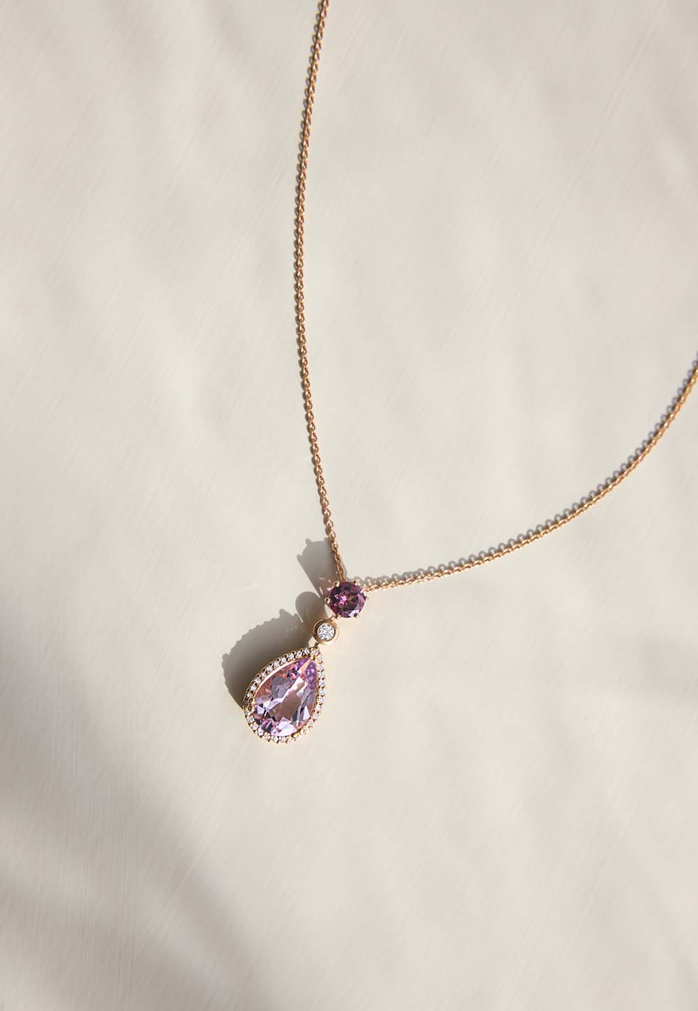 This exquisite pendant is crafted from 18ct rose gold and features a stunning array of gemstones. At the top, a round pink rhodolite, radiating a soft pink hue. Nestled below is a sparkling round brilliant cut diamond. The centrepiece is a pear cut pink amethyst, exquisitely set with three claws, its rich pink tones catching the light. This amethyst is framed by a halo of smaller diamonds, creating a dazzling effect. The pendant is suspended from an 18 inch 18ct rose gold anchor chain.