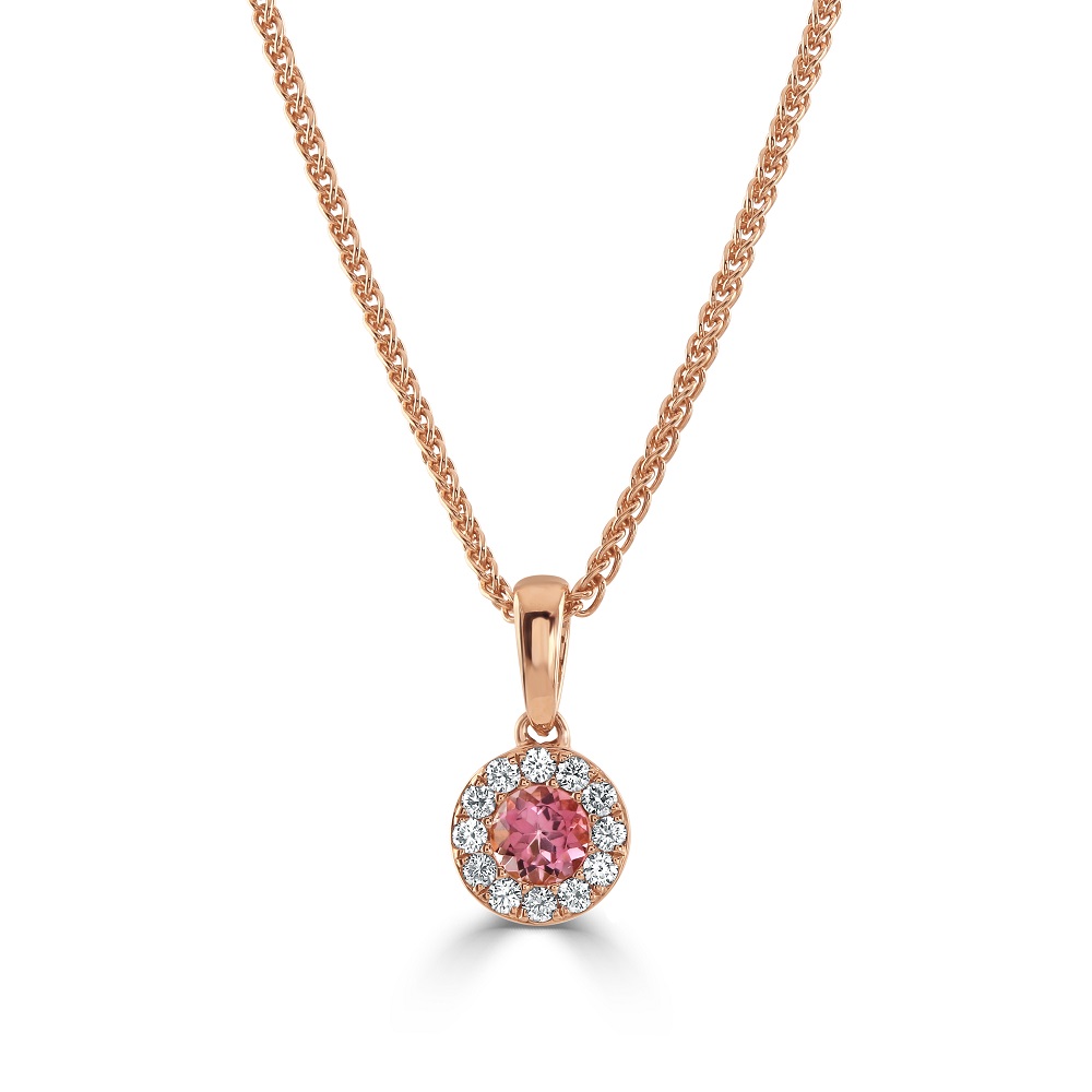 18ct Rose Gold Pink Tourmaline and Diamond Halo Pendant