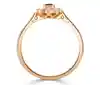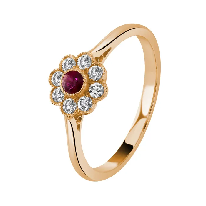 An enchanting 18ct rose gold flower-shaped halo ring, a captivating creation perfect for those who appreciate delicate design and fine craftsmanship. At the heart of this floral-inspired piece sits a vibrant round ruby, weighing 0.14 carats, rubover set to emphasize its rich colour. Surrounding the central ruby are eight round brilliant cut diamonds, collectively weighing 0.21 carats. Each diamond is also rubover set and features exquisite milgrain detailing, enhancing the vintage feel of the ring. The tapered shank complements the overall design, providing a comfortable fit and elegant look. This ring is a romantic and stylish choice, ideal for engagements, anniversaries, or as a standout addition to any jewellery collection.