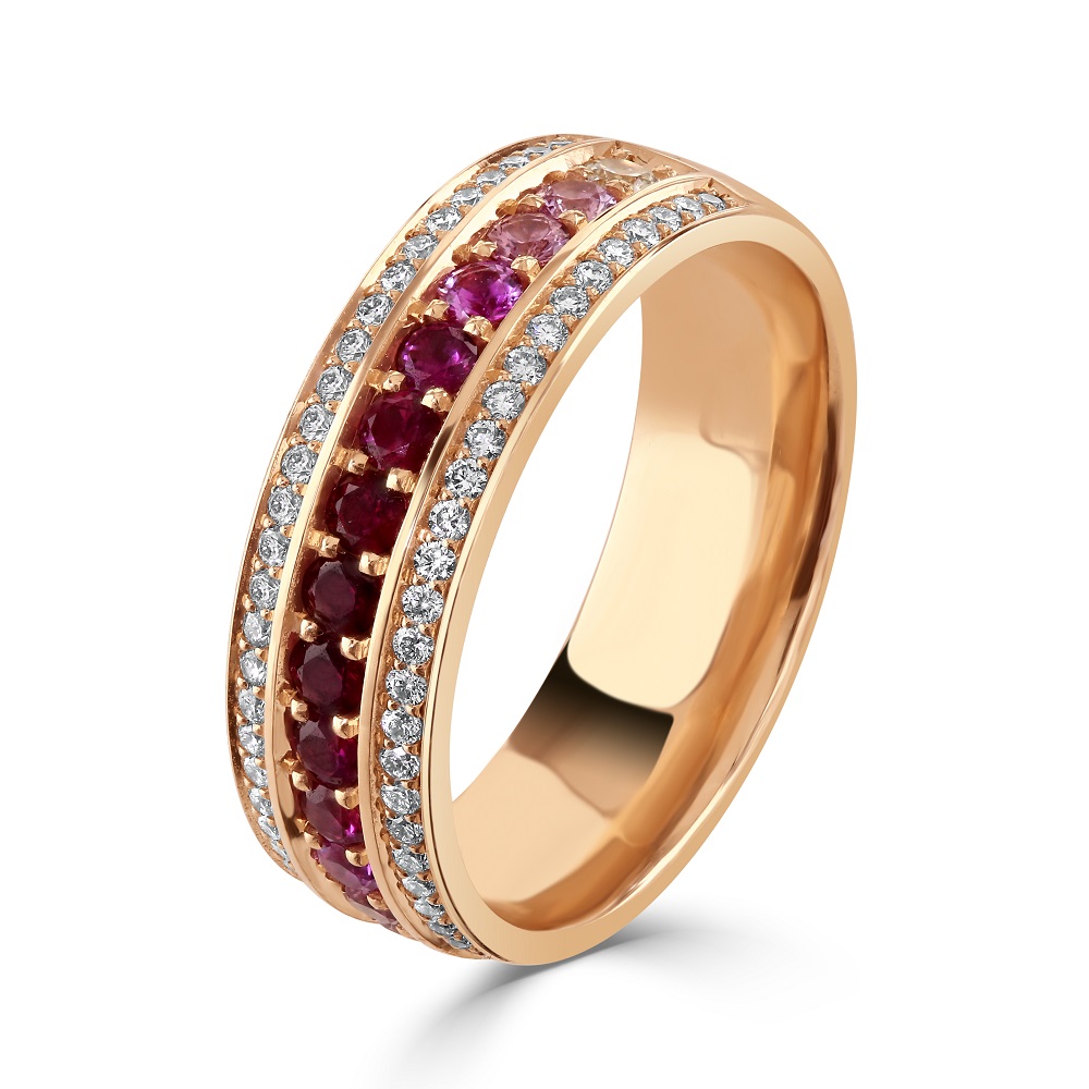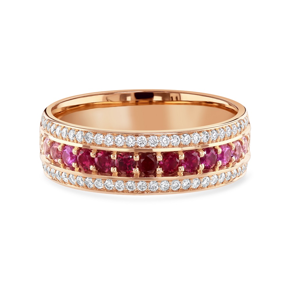 Discover the refined elegance of our 18ct rose gold ring, a masterpiece of jewellery design that combines the rich hues of rubies and pink sapphires with the sparkling brilliance of diamonds. This exquisite ring features a stunning arrangement where rubies and pink sapphires, totalling 0.75 carats, are beautifully claw-set down the centre, gradually fading into lighter tones at each end. Along each side of the band, 30 round brilliant-cut diamonds, totalling 0.30 carats, are meticulously set to create an enchanting shimmer that complements the warm tones of the rose gold. This ring is a perfect blend of luxury and sophistication, making it an ideal choice for those special occasions or as a standout addition to any fine jewellery collection.