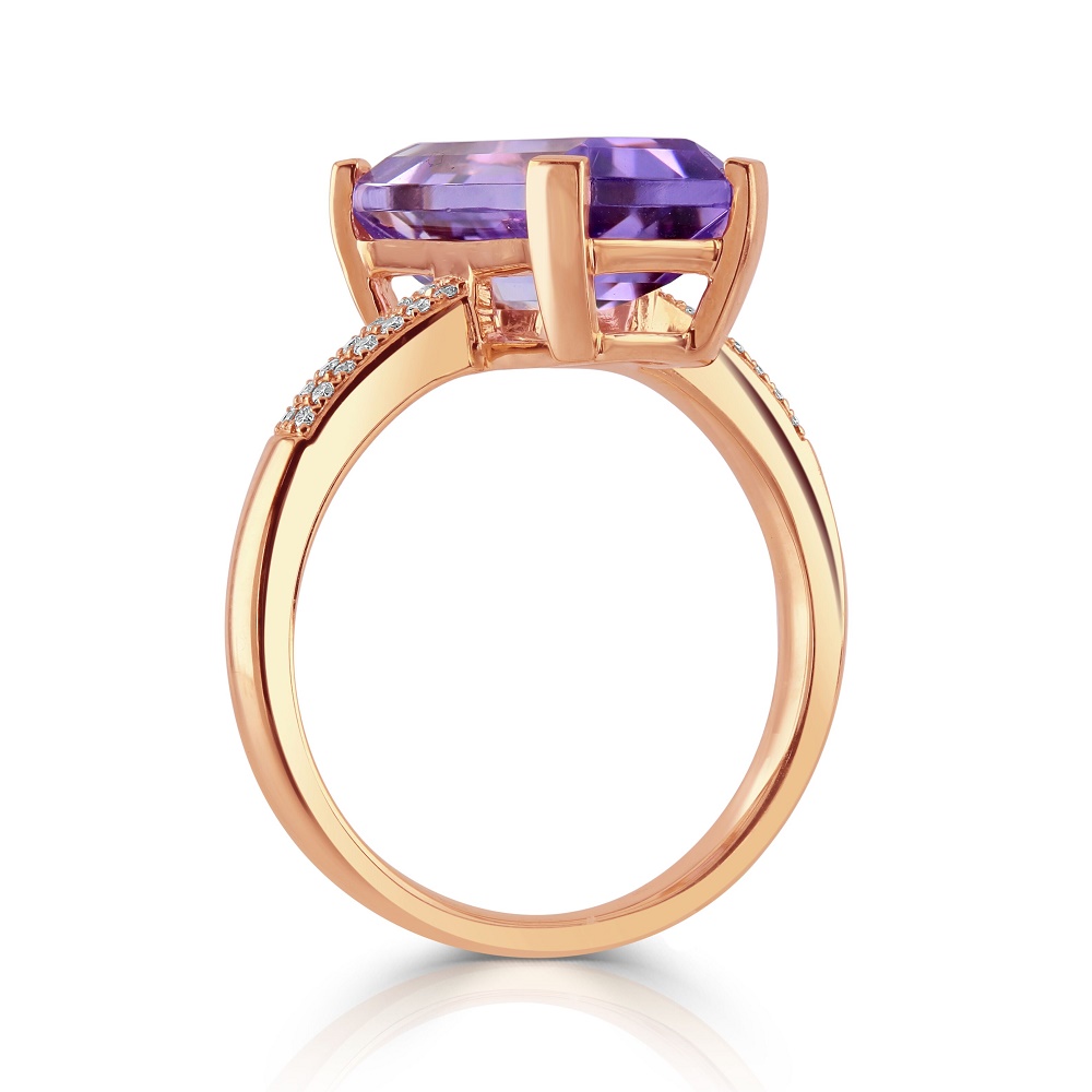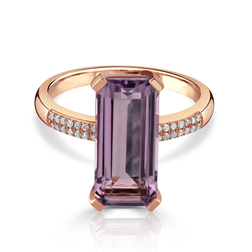 This elegant cocktail ring has a central long octagonal pink amethyst with diamonds shimmering down each shoulder. Pink Amethyst has a unique combination of colour, transparency, and beauty. Its lavender nuances bring peace, harmony and emotional balance.