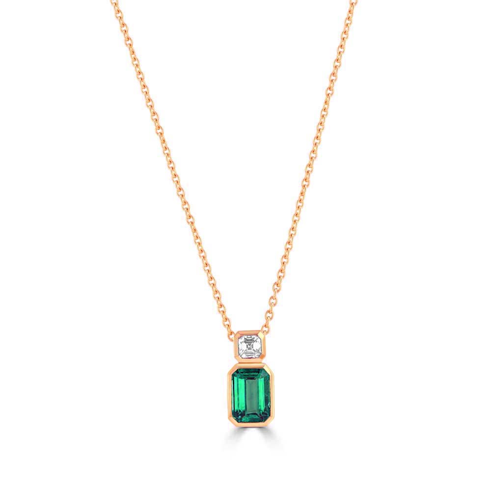 Introducing our exquisite 18ct rose gold pendant, featuring a stunning rubover set step-cut octagonal emerald, beautifully complemented by a rubover set diamond. This luxurious pendant is crafted from 18ct rose gold and is suspended from a matching 16-inch trace chain, offering a perfect blend of contemporary design and timeless elegance. The centrepiece of this pendant is a magnificent 1.22ct step-cut octagonal emerald, known for its deep, vivid green hue and exceptional clarity. The emerald’s clean lines and geometric shape are elegantly framed in a rubover setting, enhancing its natural beauty while providing a secure and sleek finish. Above the emerald, a sparkling 0.25ct diamond is also set in a rubover setting, adding a touch of brilliance that perfectly complements the rich colour of the emerald. The 18ct rose gold chain and setting add warmth and sophistication to the piece, making it ideal for both everyday wear and special occasions. This pendant is a true statement of luxury and refined craftsmanship, perfect for those who appreciate the timeless allure of emeralds and diamonds combined with the contemporary elegance of rose gold.