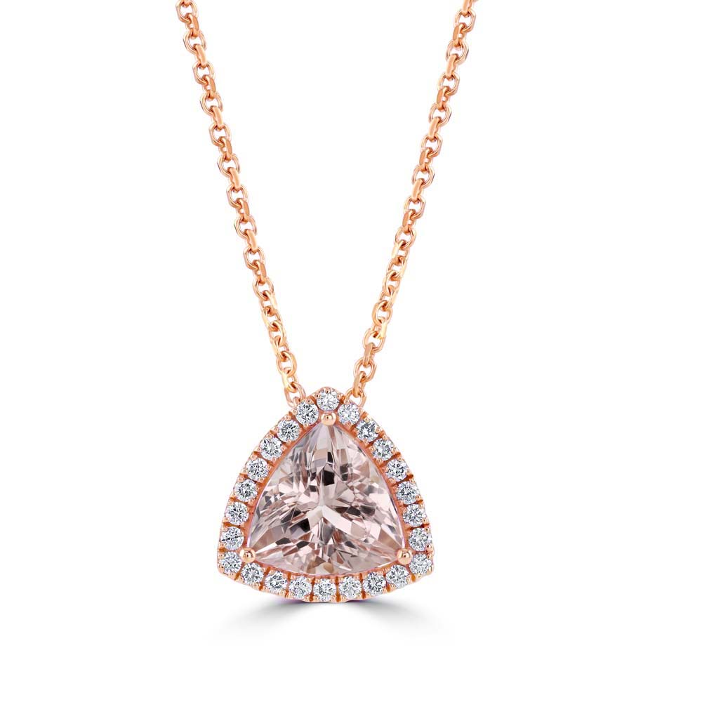A captivating 18ct rose gold pendant that exudes soft sophistication and timeless charm. At its heart lies a beautifully faceted trillion cut morganite, weighing 2.42 carats, cradled in a graceful three-claw setting that highlights the gem’s delicate peach-pink hue. Encircling the centre stone is a halo of round brilliant cut diamonds, totalling 0.22 carats, each one meticulously set to enhance the pendant’s radiant sparkle and feminine allure. The pendant is suspended from a classic 16-inch 18ct rose gold trace chain, designed to rest elegantly at the collarbone and complement the warm tones of the piece. A harmonious blend of contemporary design and romantic elegance, this pendant is a perfect expression of refined beauty and understated luxury.