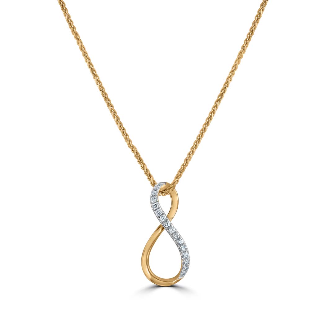 A stunning 18ct infinity pendant, a symbol of endless beauty and timeless elegance. This unique pendant features a harmonious blend of plain rose gold and diamond-set white gold, creatively designed to represent the infinity symbol. This piece captures both modern chic and classic allure, making it a versatile accessory for any wardrobe. The white gold half of the infinity symbol is adorned with sparkling diamonds, totalling 0.15 carats. These diamonds are meticulously set to enhance their brilliance against the sleek white gold backdrop. The contrast with the warm hue of the rose gold offers a captivating visual effect that draws the eye. Suspended from a luxurious 18-inch (adjustable to 16 inch) 18ct rose gold spiga chain, this pendant lays gracefully at the neckline, providing a sophisticated touch to both day and evening attire. Its robust and elegant design ensures it can be worn as a daily staple or saved for special occasions. Whether you are commemorating a special moment or simply treating yourself, this infinity pendant is an exquisite choice, symbolizing eternal love and endless possibilities. It makes a perfect gift for anniversaries, birthdays, or any celebration that calls for something truly special.