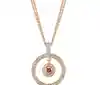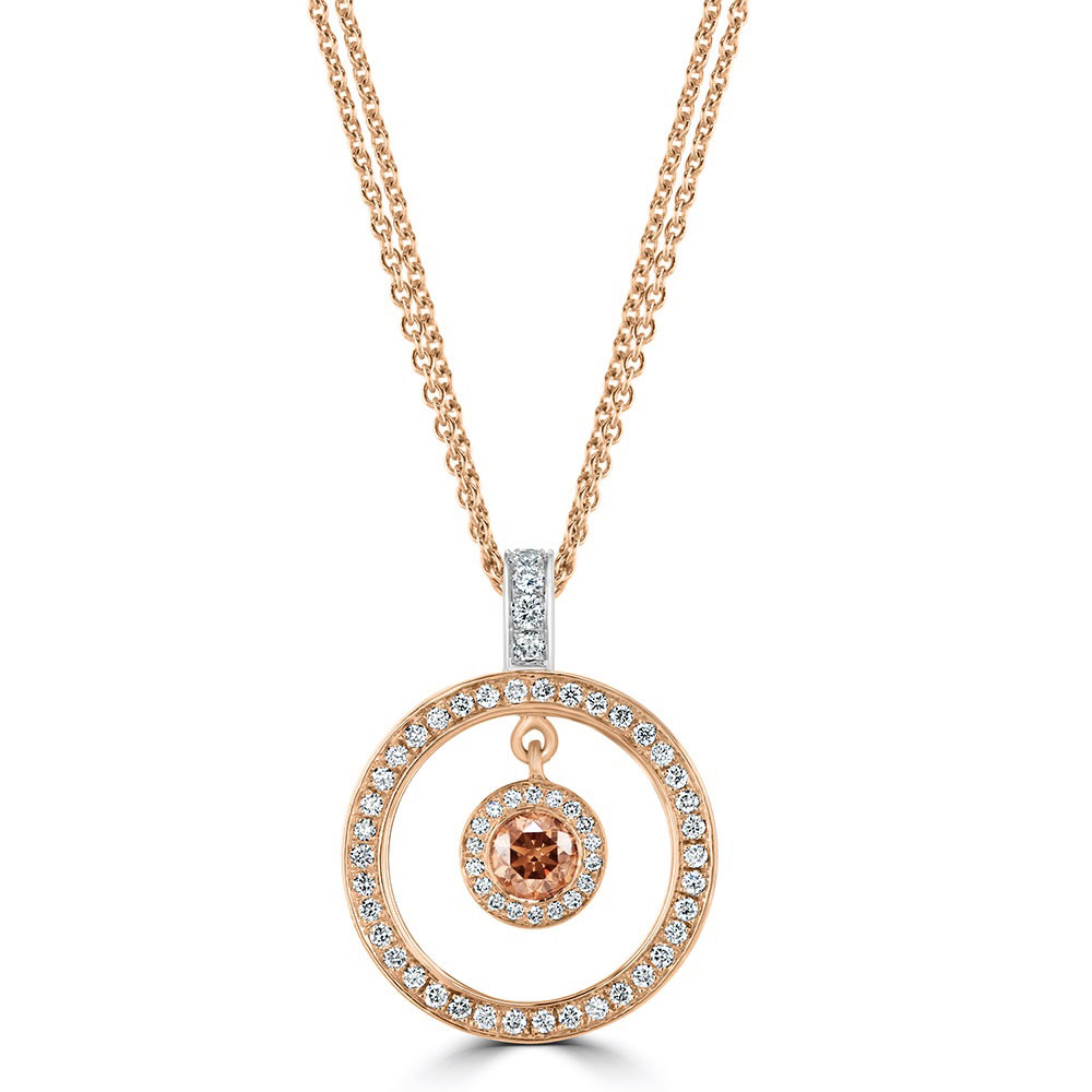 Our exquisite 18ct rose and white gold pendant is a masterful blend of luxury and design. This sophisticated piece features two open circles, elegantly crafted in rose and white gold, each set with sparkling diamonds. Sandwiched between these circles is a stunning round brown diamond, weighing 0.31 carats, encircled by a delicate diamond halo. The unique brown diamond adds a warm, rich hue that contrasts beautifully with the surrounding 102 diamonds, which cumulatively weigh 0.58 carats. Suspended from an 18ct rose gold 16-inch double trace chain, this pendant offers both durability and a refined aesthetic. Perfect for special occasions or as a standout addition to everyday wear, this pendant is a testament to intricate craftsmanship and innovative design, making it an ideal choice for those seeking a piece that is both eye-catching and elegant.