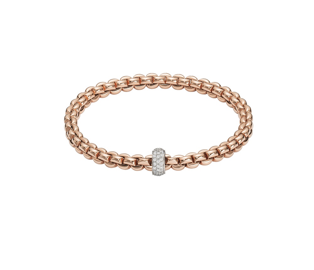 Embrace the exquisite craftsmanship of Fope Gioielli with our 18ct rose gold Flex'It Eka bracelet, a blend of luxurious design and contemporary elegance. This stunning bracelet features the patented Flex'It design, ensuring unmatched comfort and flexibility, crafted in radiant 18ct rose gold. At its centre, a white gold rondel pavé set with shimmering diamonds adds a sophisticated sparkle, with a total diamond weight of 0.37 carats. This delicate balance of rose and white gold, combined with the brilliance of diamonds, makes the bracelet a versatile accessory for any occasion, from casual outings to more formal events. A testament to Italian luxury and style, this bracelet is perfect for those who value elegance and innovative design.