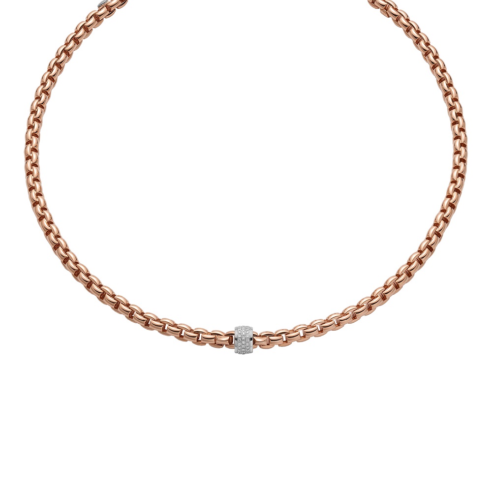An exquisite 18ct rose gold necklace from the Flex'It Eka range by Fope Gioielli, a testament to Italian luxury and craftsmanship. This necklace stands out with its innovative design, featuring a single rotatable rondel pavé set with three rows of round brilliant cut diamonds, ensuring a captivating sparkle from every angle. The total diamond weight of 0.53ct, combined with the necklace's 43cm length, makes it a versatile piece that gracefully adorns the neckline, offering an unmatched elegance and shimmer. Crafted from the finest 18ct rose gold, this necklace not only epitomizes sophistication but also adds a warm, feminine touch to any ensemble. Perfect for those who appreciate the harmony of modern design and timeless beauty, the Flex'It Eka necklace by Fope Gioielli is a remarkable addition to any sophisticated jewellery collection.