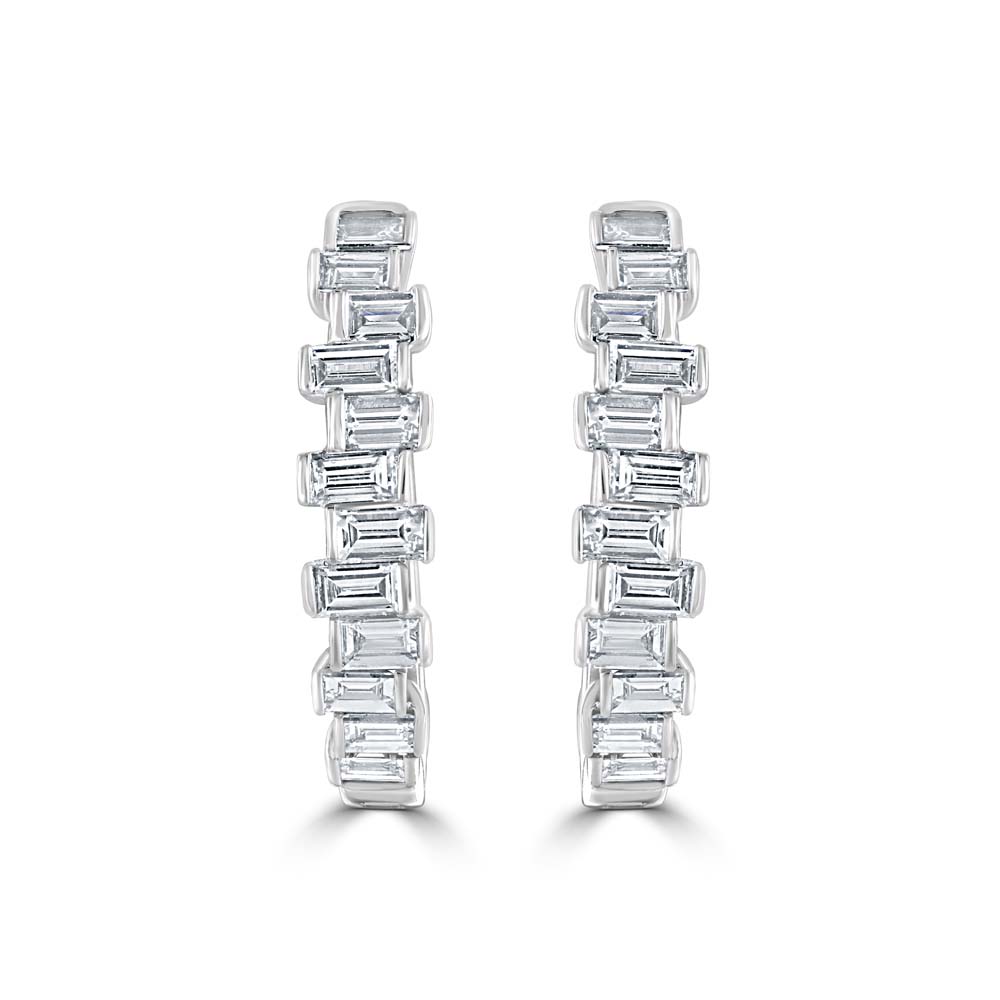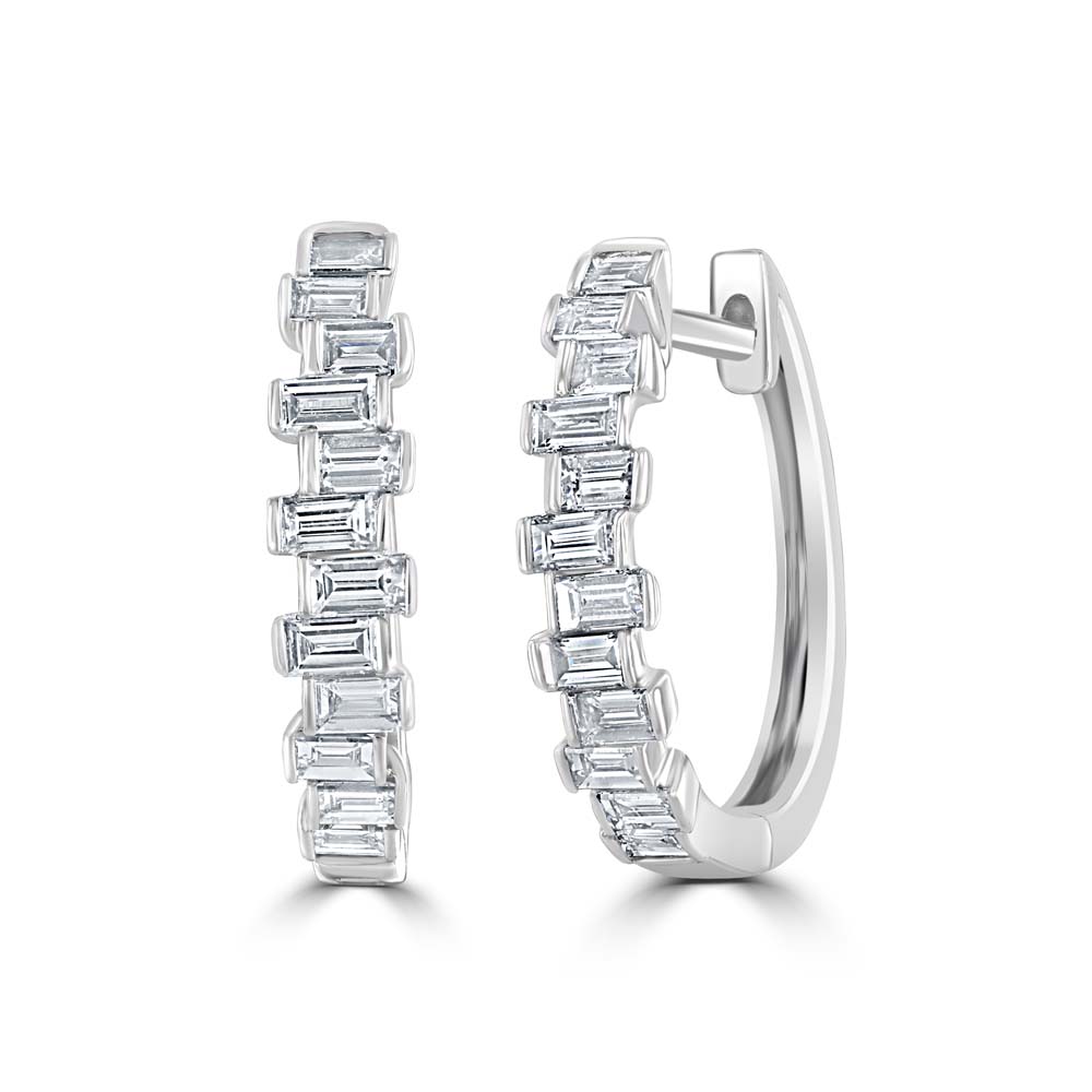 Add a touch of modern elegance to your jewellery collection with these stunning 18ct white gold hinged hoop earrings, featuring a striking arrangement of twelve baguette cut diamonds. Each diamond is part rubover set in a dynamic zigzag pattern, creating a bold yet refined silhouette that sparkles with every movement. With a total diamond weight of 0.45cts, these earrings offer the perfect balance of contemporary design and timeless luxury. The hinged hoop style ensures a secure and comfortable fit, making them ideal for both everyday wear and special occasions.