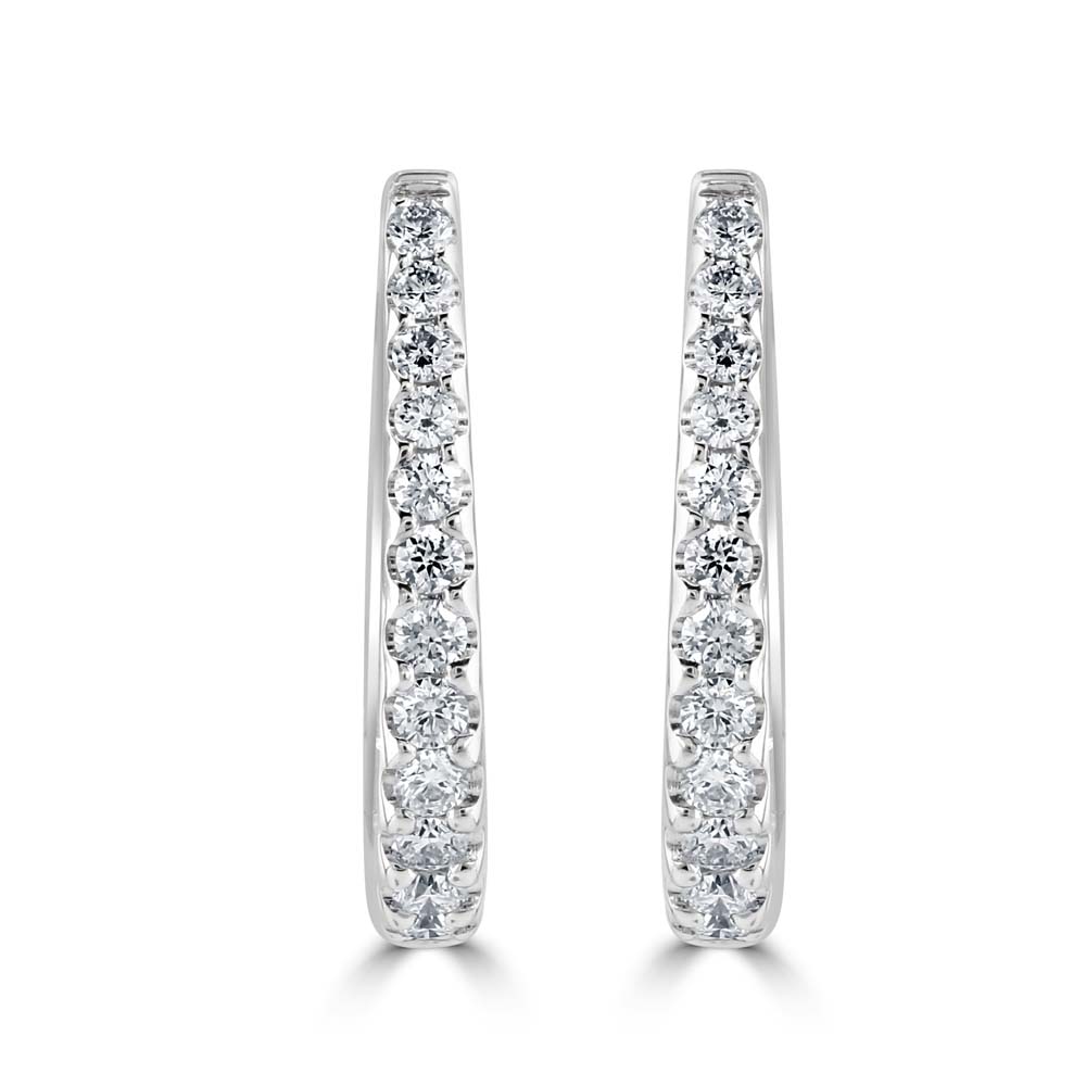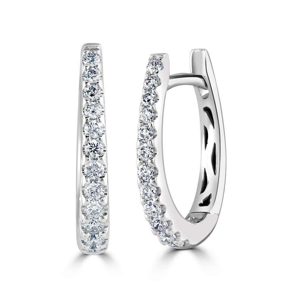 Introducing our sophisticated 18ct white gold oval hinged hoop earrings, a stunning addition to any elegant jewellery collection. These beautifully designed earrings feature twelve graduated round brilliant-cut diamonds, totalling 0.25 carats, that cascade elegantly along the sleek contours of the hoop. The sparkling diamonds are carefully set to enhance their natural brilliance and shine, providing a radiant glow that complements the polished white gold. The oval shape of these hoops offers a contemporary twist on a timeless design, while the hinged mechanism ensures they are both secure and comfortable for all-day wear. The premium 18ct white gold setting not only offers a luxurious feel but also a durable finish that stands the test of time. Perfect for any occasion, from casual gatherings to more formal events, these hoop earrings add a touch of sophistication and subtle glamour to any ensemble. Ideal for those who appreciate refined beauty and understated luxury, these earrings are sure to become a cherished part of your jewellery collection, whether as a gift or a personal treasure.