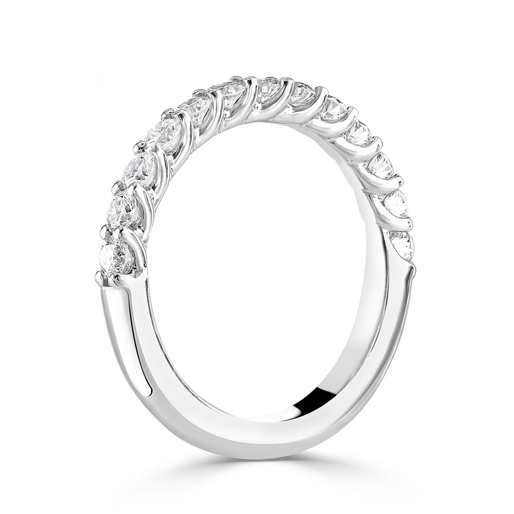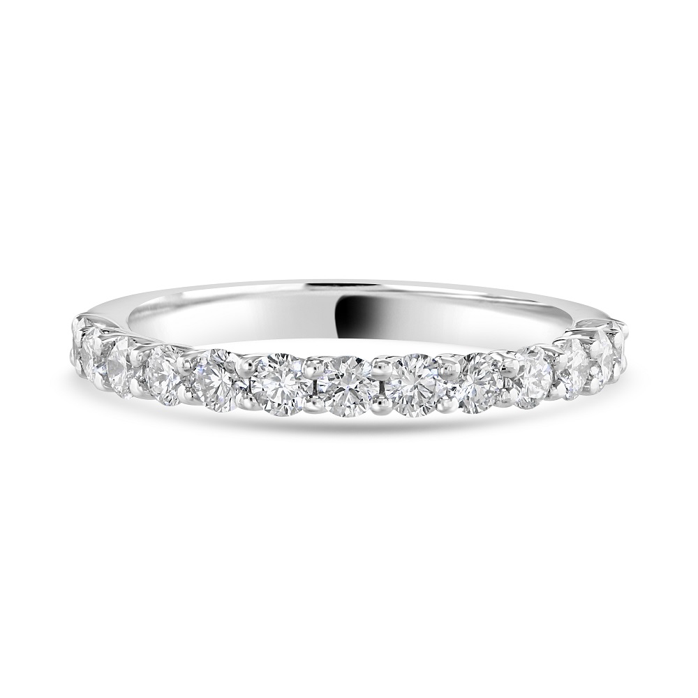 Indulge in the classic beauty of our 18ct white gold half eternity ring, meticulously crafted to showcase a timeless elegance. This sophisticated ring features 13 round brilliant cut diamonds, each securely held by a four-claw setting, totalling a substantial 0.75 carats. The diamonds are expertly arranged to provide a continuous band of sparkle that wraps elegantly around the finger, enhancing its overall brilliance and appeal. Crafted from premium 18ct white gold, this ring combines durability with a sleek, polished finish, making it perfect for celebrating anniversaries, as a wedding band, or for adding a touch of luxury to everyday wear. Embrace this exquisite piece as a symbol of eternal love, designed to dazzle and delight for years to come.