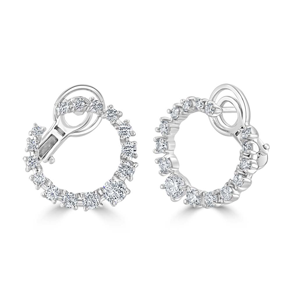 Elevate your jewellery collection with these exquisite 18ct white gold open circle hoop earrings, designed to blend timeless elegance with contemporary sophistication. Each hoop features fifteen graduated round brilliant cut diamonds, meticulously claw set in a graceful arc that enhances their natural sparkle and creates a striking visual flow. With a total diamond weight of 1.11cts, these earrings offer a radiant display of luxury, perfect for both everyday wear and special occasions. The clip and post fittings ensure a secure and comfortable fit, making them a refined choice for pierced ears. Whether you're searching for a premium jewellery gift, a pair of designer diamond hoops, or a standout addition to your fine jewellery collection, these earrings are a stunning expression of craftsmanship and style.