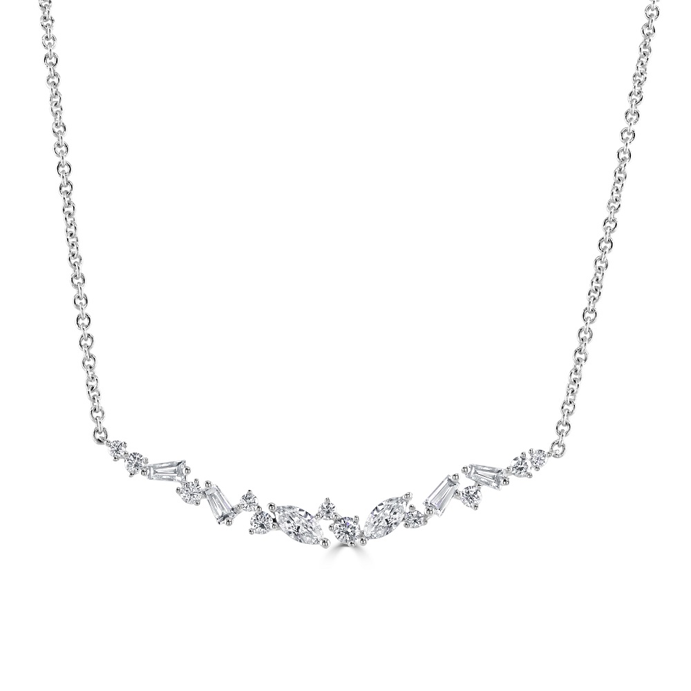 Enhance your jewellery collection with our exquisite 18ct white gold necklace, a masterpiece of design and luxury. This necklace features a stunning array of 17 diamonds, each claw set and showcasing a variety of cuts, artfully arranged in a graceful horizontal curve. The diverse diamond cuts create a captivating display of light and brilliance, totalling 0.52 carats. Suspended on a delicate 15-inch trace chain crafted from the same 18ct white gold, this piece drapes elegantly along the collarbone, making it perfect for both high and low necklines. Ideal for special occasions or as a standout addition to your everyday wardrobe, this necklace promises to add a touch of sophistication and sparkle to any outfit.