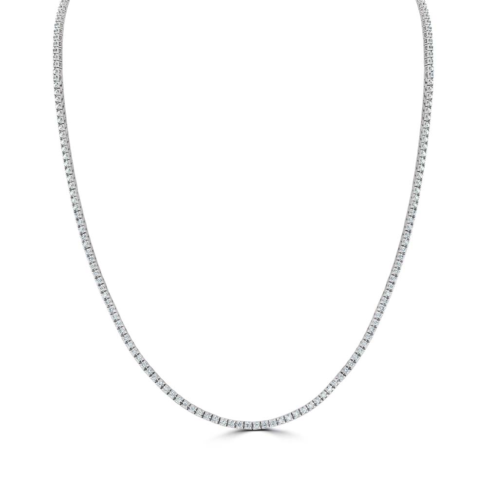 A luxurious 18ct white gold line necklet, an exquisite piece of jewellery that blends timeless elegance with contemporary design. This stunning necklet features 195 round brilliant cut diamonds, each meticulously four claw-set within square-shaped links, creating a dazzling display of light and brilliance. With a total diamond weight of 2.10 carats, this necklet is designed to capture and reflect light beautifully, ensuring that it stands out with unparalleled sparkle. Crafted from premium 18ct white gold, this necklet boasts a sleek and polished finish that enhances the natural radiance of the diamonds. The geometric design of square links adds a modern touch to the classic beauty of the brilliant diamonds, making it a perfect piece for sophisticated events or as a standout addition to your everyday wardrobe. Ideal for those who appreciate fine craftsmanship and detailed design, this diamond line necklet is a statement piece that speaks of luxury and style. Whether you are looking to elevate a special occasion ensemble or add a touch of glamour to your casual attire, this necklet promises to be a versatile and cherished addition to any jewelry collection.