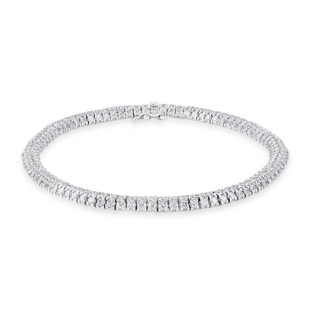 Indulge in timeless elegance with this stunning 18ct white gold line bracelet, featuring three rows of round brilliant-cut diamonds for a look that radiates sophistication. With a total diamond weight of 3.06 carats, graded G colour / SI clarity, this piece offers exceptional sparkle and refined beauty. The bracelet is secured with a box and tongue clasp, ensuring both comfort and security. Perfect for special occasions or as a luxurious everyday accessory, this bracelet combines classic design with superior craftsmanship—a true statement of elegance.