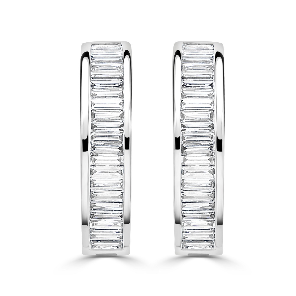Our luxurious 18ct white gold hinged hoop earrings are each adorned with 22 elegantly channel-set baguette cut diamonds, totalling 1.50 carats. These exquisite diamonds are precisely aligned within the sleek white gold framework, offering a continuous stream of shimmer and a distinctly modern geometric appeal. The hinged design ensures easy wearability and secure closure, making these earrings both functional and fashionable. Perfect for sophisticated evenings or adding a touch of glamour to everyday wear, these hoop earrings blend classic elegance with contemporary design, making them an essential addition to any fine jewellery collection.
