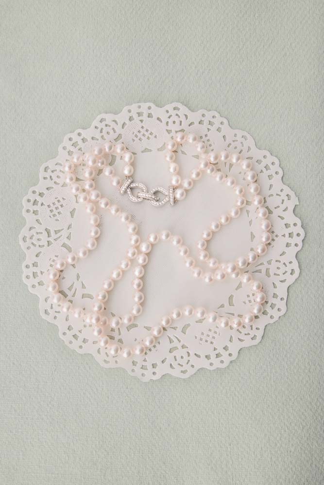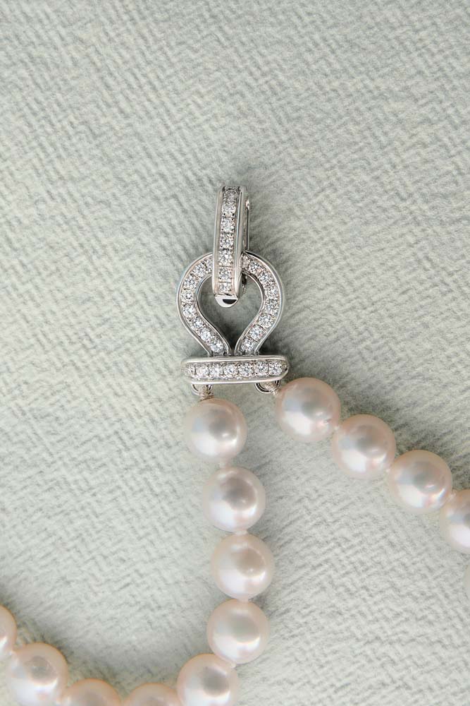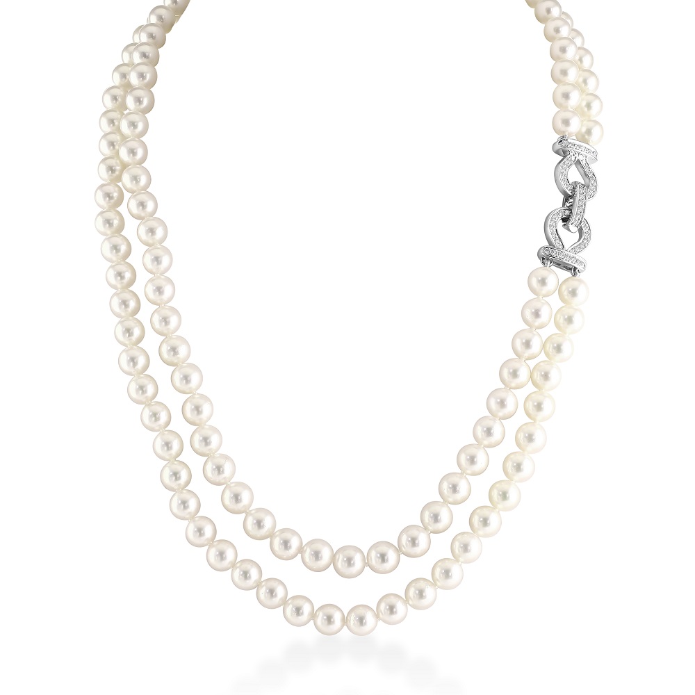 An elegant double-stranded necklace, featuring two exquisite rows of Akoya cultured pearls, numbering 62 and 57, respectively. This luxurious piece is fastened with a diamond-encrusted double loop and bar clasp, adding a sparkling touch of sophistication. The pearls, with their impressive diameters ranging from 6.5 to 7.0mm, exude a classic beauty that complements any look.