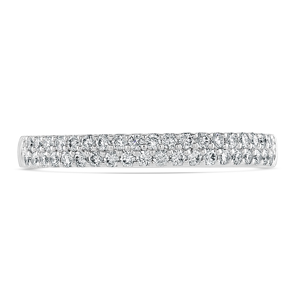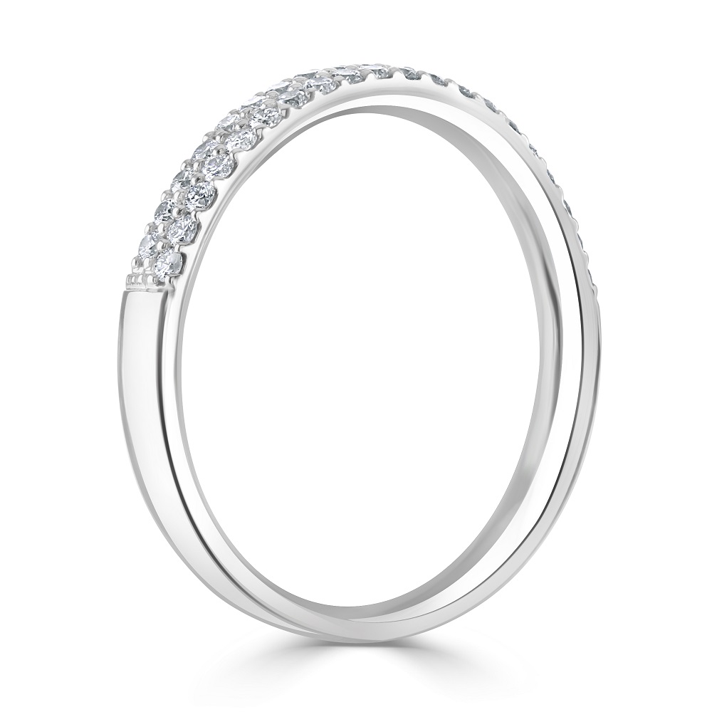 A beautiful 18ct white gold two row half eternity ring pavé claw set with sparkling round brilliant cut diamonds. Other sizes and variations are available, please contact the store for more information.