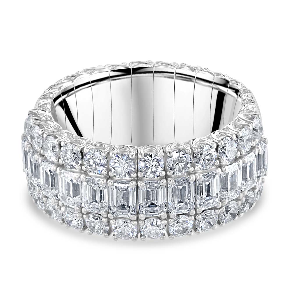 Elevate your jewellery collection with this exquisite 18ct white gold Picchiotti Xpandable™ half eternity ring, masterfully crafted in Italy to combine luxury and innovation. Featuring a stunning row of 12 emerald cut diamonds claw-set along the centre, this elegant design is flanked by two rows of 12 round brilliant cut diamonds on either side, creating a dazzling display of brilliance and symmetry. Designed to fit finger sizes M ½ to S, the Xpandable™ technology ensures a comfortable and flexible fit without compromising on style. Perfect for marking a special occasion or adding timeless elegance to everyday wear, this luxury diamond eternity ring is a true statement of sophistication.