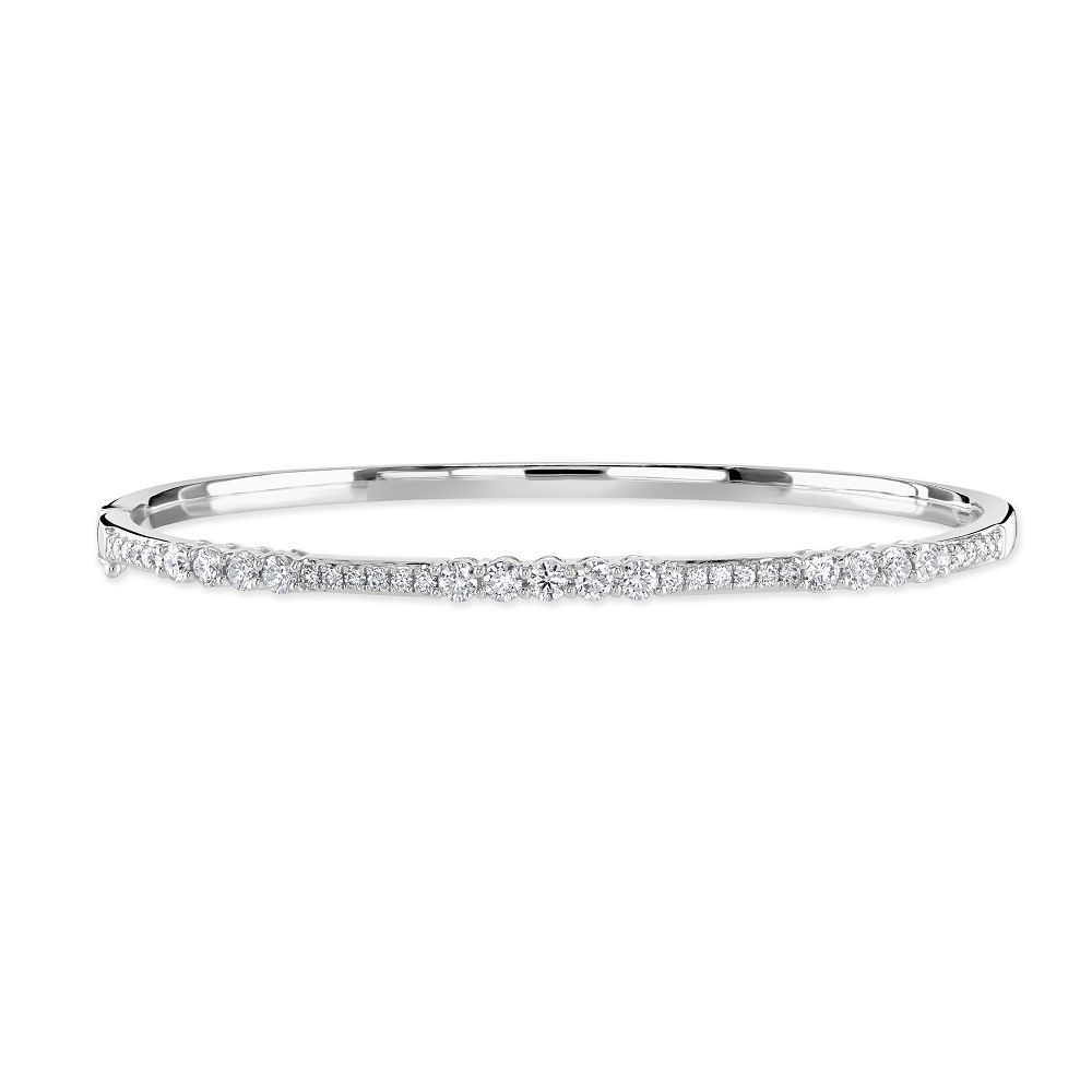 A luxurious 18ct white gold oval hinged bangle, a masterpiece of fine jewellery design, blending classic style with modern elegance. This exquisite bangle features an alternating pattern of larger claw-set round brilliant cut diamonds and smaller grain-set diamonds, creating a dazzling rhythmic sparkle along the entire piece. With a total diamond weight of 1.17 carats, the brilliance and clarity of each diamond are showcased beautifully against the sleek, polished white gold. The hinged design ensures a comfortable fit and easy wearability, perfect for everyday elegance or special occasions. This sophisticated bangle is ideal for those who appreciate intricate details and a timeless design that makes a stunning statement.