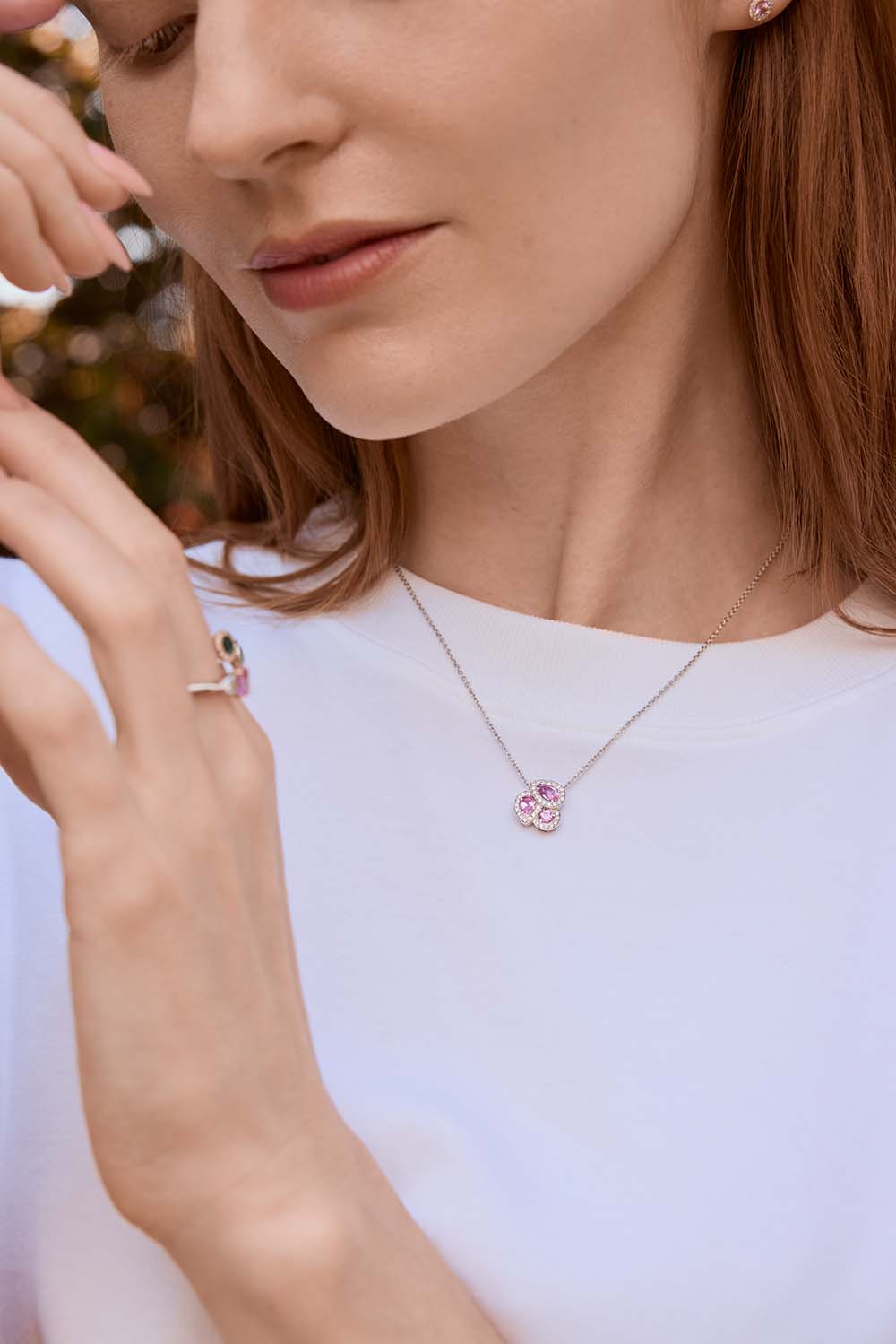 A stunning 18ct white gold pendant, a captivating showcase of elegance and style. This exquisite piece features three pink sapphires: two pear-shaped and one round, totalling 1.23 carats, each meticulously set to enhance their vibrant hues and sparkling brilliance. Surrounding these sapphires, 37 round brilliant cut diamonds, totalling 0.20 carats, create a dazzling halo that beautifully frames the central gemstones.