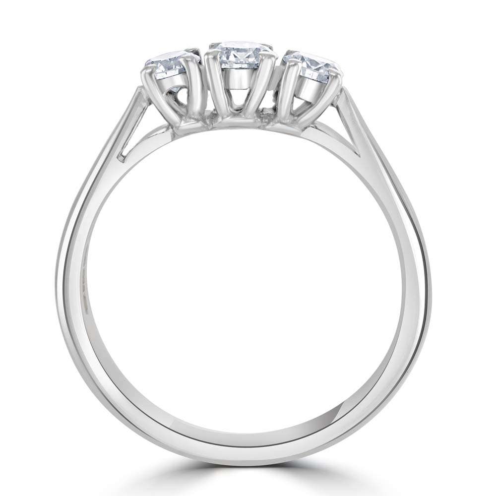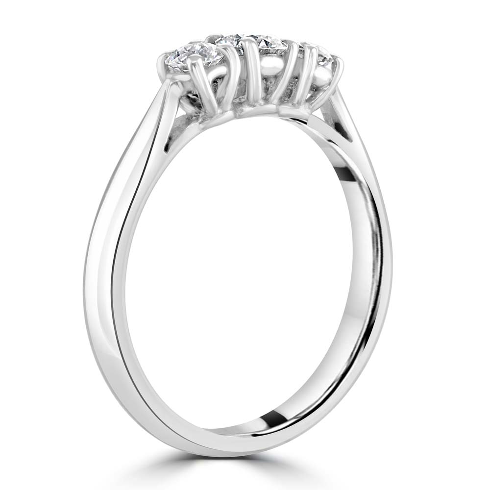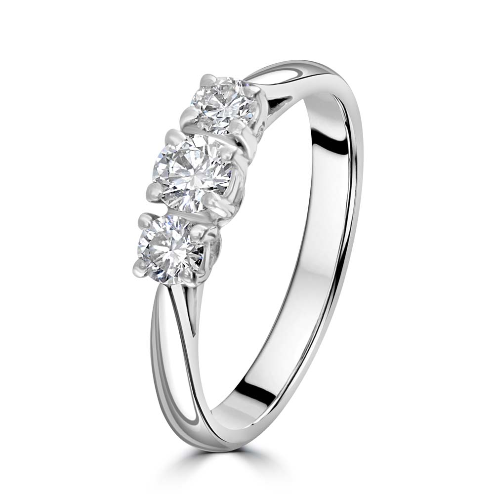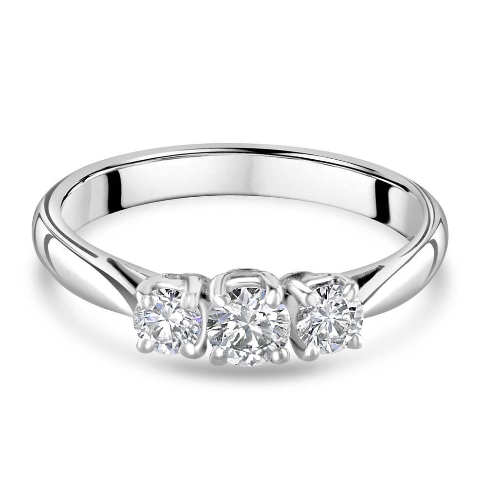Elevate your elegance with our 18ct white gold trilogy ring, beautifully crafted with round brilliant cut diamonds set in a secure four-claw setting. This timeless piece showcases three stunning diamonds that symbolize the past, present, and future of your love story, making it a perfect choice for engagements, anniversaries, or any special occasion. The total diamond weight of this exquisite ring is 0.52 carats, ensuring a dazzling display of brilliance. With an H colour grade, the diamonds exhibit a near-colourless appearance that enhances their natural sparkle. The SI1 clarity grade ensures a remarkable shine, with inclusions visible only under magnification, allowing the diamonds' true beauty to shine through. Crafted from premium 18ct white gold, this trilogy ring combines luxurious aesthetics with lasting durability. The four-claw setting not only secures the diamonds but also allows maximum light to pass through, enhancing their brilliance. Ideal for those who appreciate refined elegance and exceptional craftsmanship, this 18ct white gold trilogy ring is a true symbol of enduring love and sophistication.