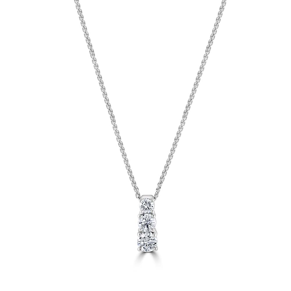 Sleek and sophisticated, this 18ct white gold pendant showcases a striking vertical arrangement of three graduated round brilliant cut diamonds, each claw set to maximise brilliance and light reflection. The diamonds—0.46ct, 0.31ct, and 0.20ct—create a graceful cascade of sparkle, symbolising timeless elegance and refined simplicity. Suspended from a classic 16-inch spiga chain, the pendant sits beautifully at the collarbone, making it perfect for both everyday luxury and special occasions. The spiga chain’s intricate weave adds subtle texture and strength, complementing the pendant’s clean lines and radiant design. A timeless piece with modern appeal, this pendant is a stunning addition to any fine jewellery collection—perfect for gifting or elevating your personal style.