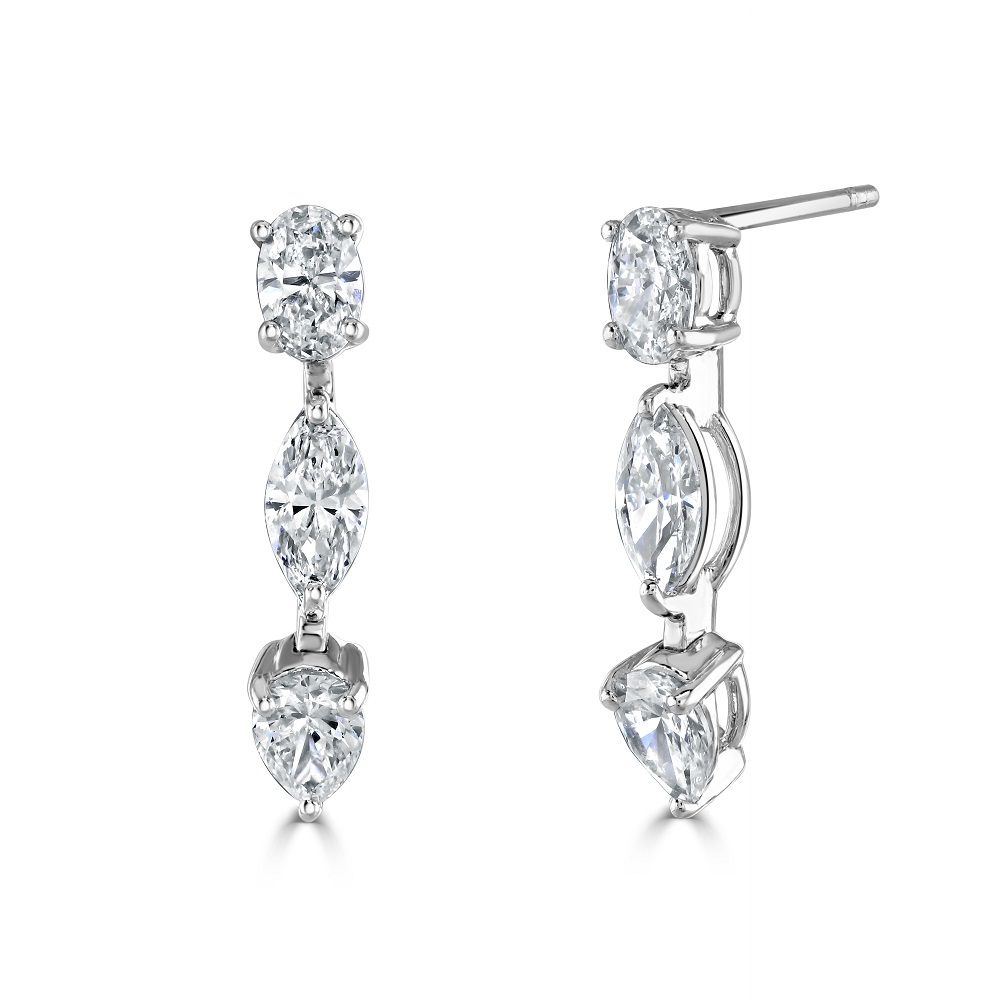 Our 18ct white gold drop stud earrings showcase a stunning arrangement of mixed diamond cuts. These exquisite earrings feature an oval cut diamond at the top, a marquise cut diamond in the centre, and a pear cut diamond gracefully dangling at the bottom, all expertly claw set to enhance their individual brilliance. With a total approximate diamond weight of 1.32 carats, these earrings sparkle with unparalleled clarity and radiance. Crafted from premium 18ct white gold and secured with post and butterfly fittings for comfort and safety, these drop stud earrings are perfect for adding a touch of sophistication to any ensemble, ideal for special occasions or as a luxurious gift.