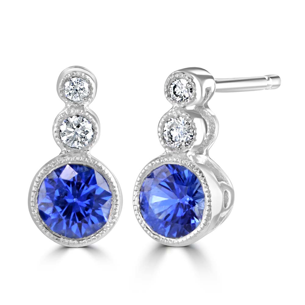 Elevate your style with our exquisite 18ct white gold drop earrings, designed in a charming vintage style. These elegant earrings feature a captivating vertical line arrangement of two rubover-set round brilliant cut diamonds and a stunning single rubover-set round sapphire, each framed by a delicate milgrain edge for a touch of antique allure. The diamonds weigh a total of 0.09ct, boasting F/G colour and VS clarity, ensuring exceptional sparkle and brilliance. The sapphire adds a dramatic splash of colour with a total weight of 0.76ct. Complete with secure post and butterfly fittings, these earrings promise both comfort and style. Perfect for special occasions or adding a sophisticated flair to your everyday look, these earrings are a timeless addition to any jewellery collection.