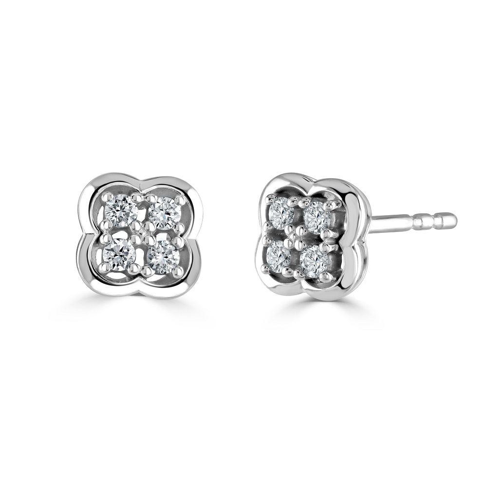 Discover the allure of our 18ct white gold stud earrings, beautifully crafted in a distinctive quatrefoil shape. Each earring is set with four claw-set round brilliant cut diamonds, providing a total diamond weight of 0.14ct. The diamonds are graded H in colour and SI in clarity, ensuring a bright and clear sparkle that catches the light with every turn. These elegant earrings come equipped with secure post and butterfly fittings, offering both comfort and durability. Perfect for adding a sophisticated touch to any outfit, these diamond stud earrings are a must-have for those who appreciate luxurious style and exquisite craftsmanship. Enhance your jewellery collection with these stunning white gold and diamond earrings, ideal for both special occasions and everyday elegance.