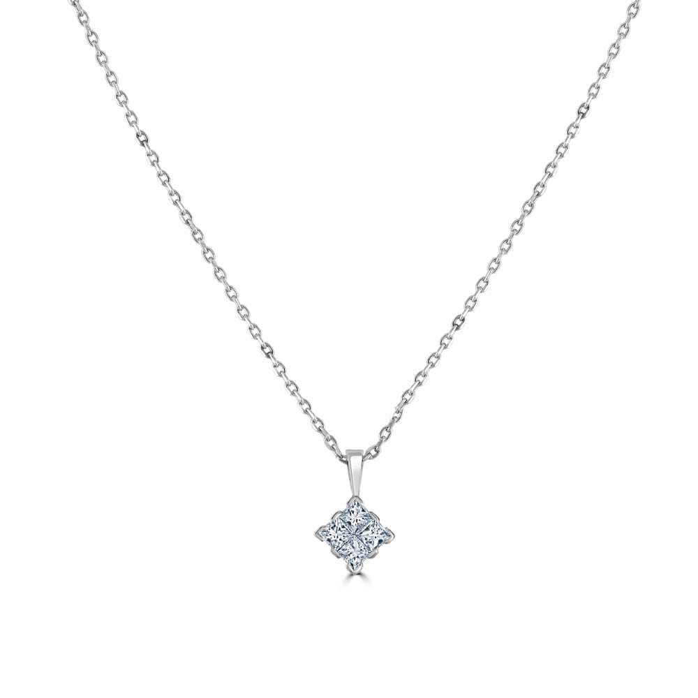 Introduce a touch of geometric elegance to your jewellery collection with our striking 18ct white gold diamond-shaped pendant. This sophisticated piece features a bold, diamond-shaped design, exquisitely crafted in lustrous white gold. At the heart of the pendant, four princess cut diamonds are brilliantly showcased, each secured with corner claws to enhance their natural sparkle and brilliance. These diamonds combine for an approximate total weight of 0.55 carats, providing a captivating glow that catches the eye. Suspended from an elegant 16-inch white gold trace chain, this pendant lays gracefully at the neckline, making it perfect for both everyday wear and special occasions. Ideal for those who appreciate contemporary designs with a classic touch, this diamond pendant elevates any outfit with its modern charm and luxurious appeal