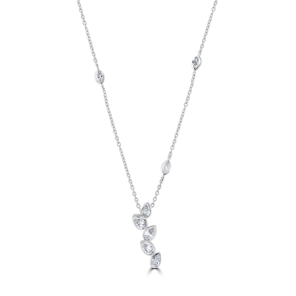 Enhance your elegance with our 18ct white gold pendant, showcasing a stunning vertical line of five rubover set pear cut diamonds, each meticulously arranged with their points facing upwards. This exquisite pendant is suspended from an 18-inch trace chain, crafted from premium 18ct white gold, adding a touch of sophistication to any ensemble. The pendant features a total of 0.87 carats of pear cut diamonds, arranged in a sleek vertical line that draws the eye and captures the light beautifully. Adding to the allure, three rubover set marquise cut diamonds, totalling 0.27 carats, are artfully scattered along the chain, creating a harmonious blend of brilliance and design. Crafted with precision and attention to detail, this pendant combines the timeless appeal of pear and marquise cut diamonds with the modern elegance of a rubover setting. The 18ct white gold trace chain provides a luxurious yet durable foundation, making this piece perfect for both everyday wear and special occasions.