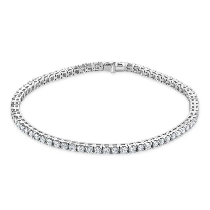 Experience the epitome of luxury and elegance with our 18ct white gold line bracelet. This stunning piece of fine jewellery features 72 round brilliant-cut diamonds, each meticulously set in a secure four-claw setting to enhance their natural sparkle and beauty. With a total diamond weight of 2.52 carats, this bracelet dazzles brilliantly, making a striking statement of sophistication. The bracelet is designed to ensure not only aesthetic appeal but also security and comfort. Measuring 17.5cm in length, it is equipped with a reliable tongue clasp and a safety locking system, providing peace of mind that it will stay beautifully in place on your wrist. Ideal for special occasions or as a luxurious addition to your daily wear, this line bracelet is a timeless choice for those who appreciate the finer things in life. It perfectly embodies a blend of classic elegance and contemporary security features, making it a cherished piece in any jewellery collection.