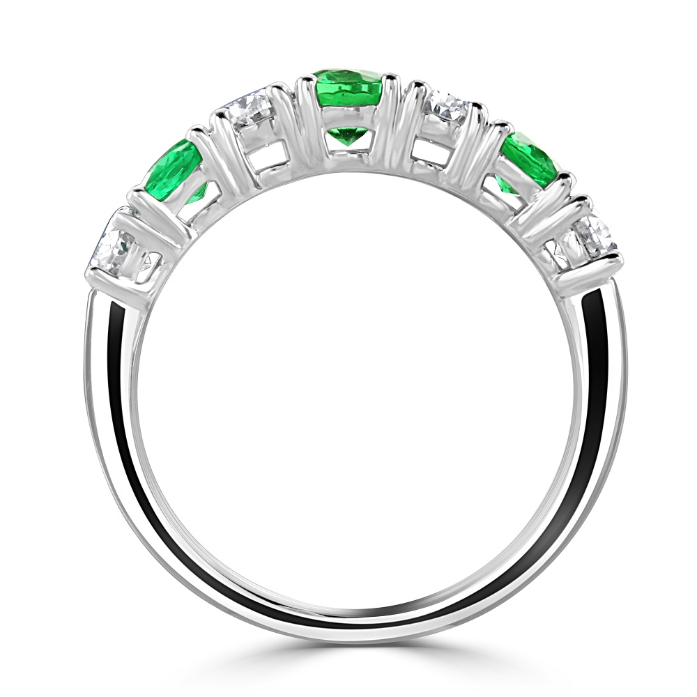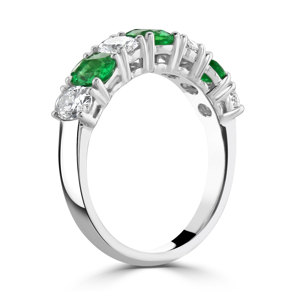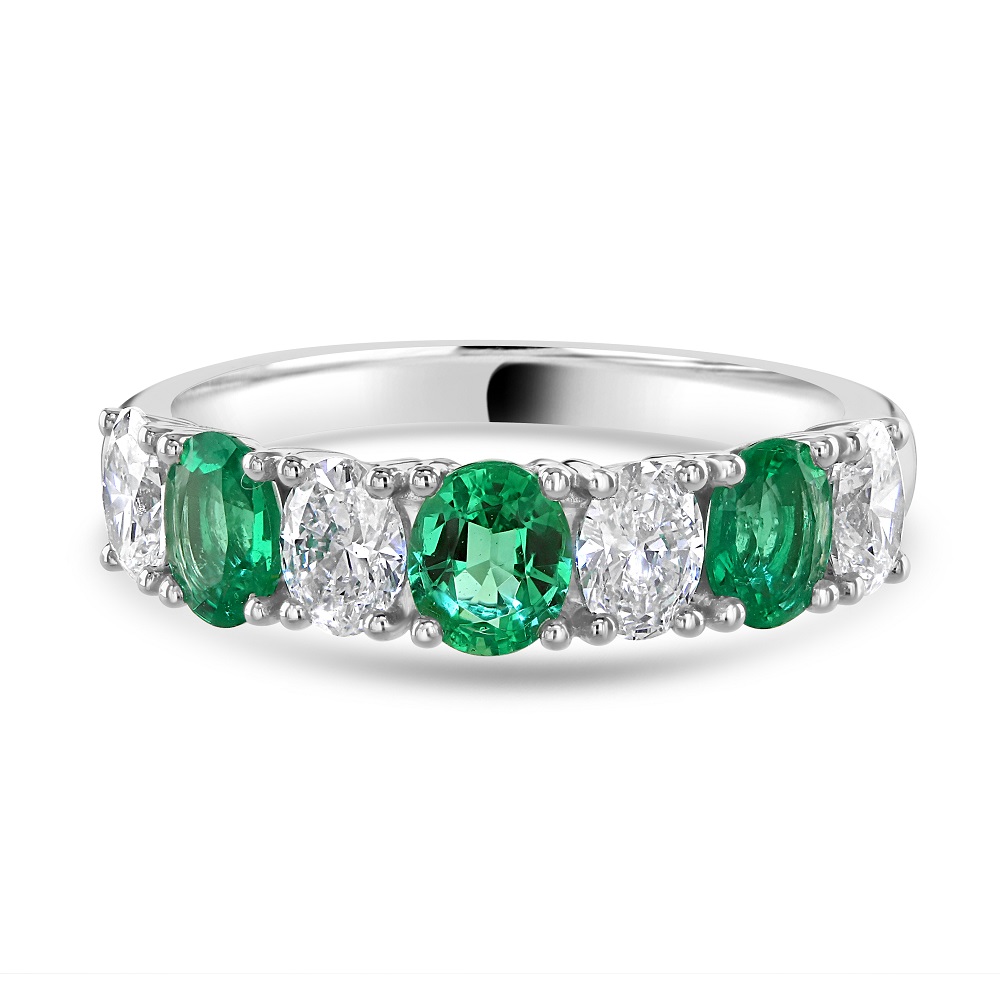 A luxurious 18ct white gold eternity ring. This stunning ring features a beautifully alternating sequence of four oval cut emeralds and three oval cut diamonds, each gemstone meticulously claw-set to showcase its unique brilliance and colour. With a total emerald weight of 0.90ct, these vibrant green stones symbolize renewal and growth, while the diamonds, weighing in at a total of 0.92ct, offer a dazzling contrast with their unmatched clarity and sparkle.